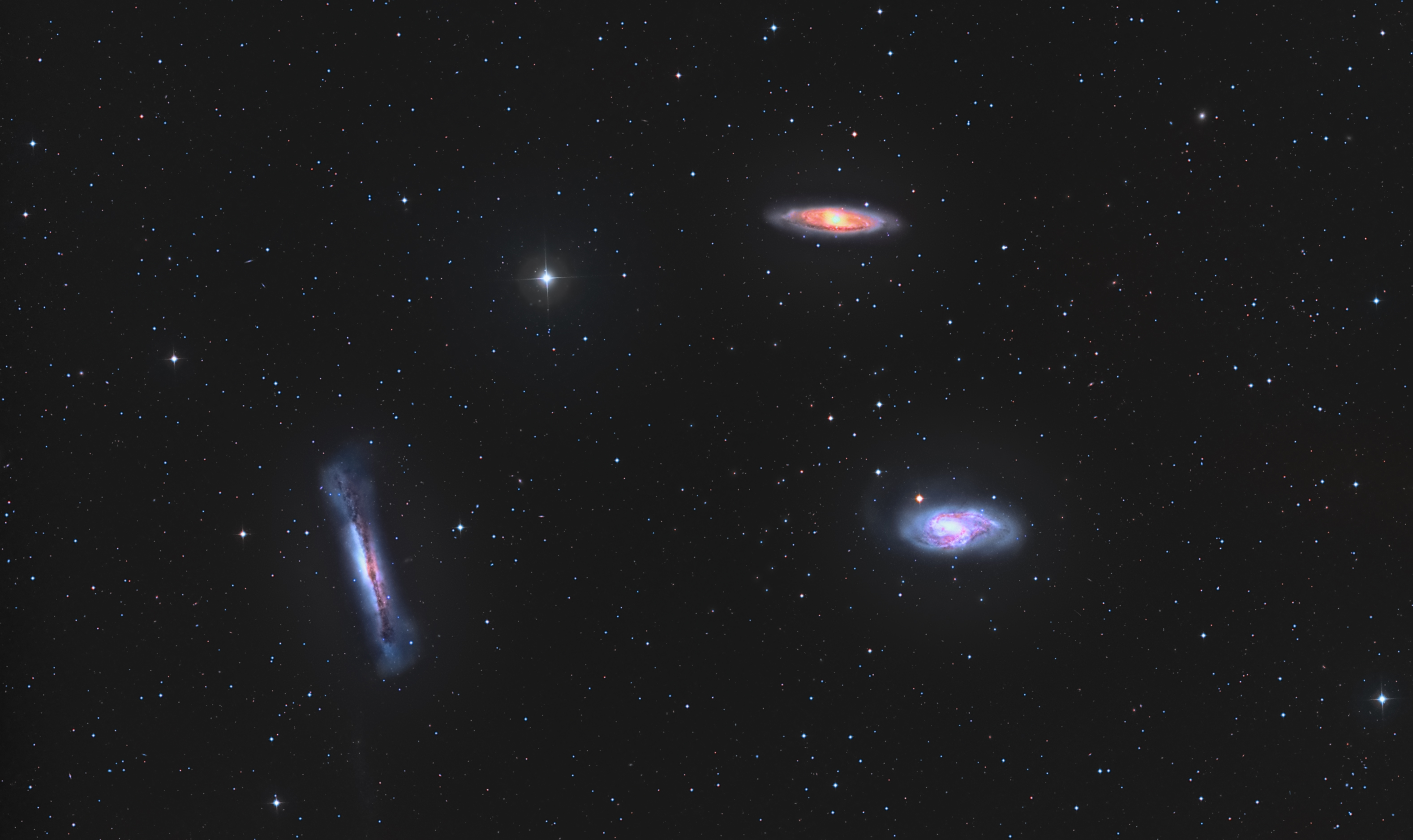 Diese äußerst fotogene Galaxienfamilie im Sternbild des Löwen war das erklärte Ziel der ersten Kooperation der beiden österreichischen Astrofotografen Gerhard Molinaro und Oliver Czernetz. Das Trio liegt ungefähr 35 Millionen Lichtjahre entfernt und enthält die Objekte Messier 65 und 66, sowie die Spiralgalaxie NGC 3628. Die Aufnahmen entstanden über mehrere Nächte im Jahr 2013 in Wagna in der südlichen Steiermark.
