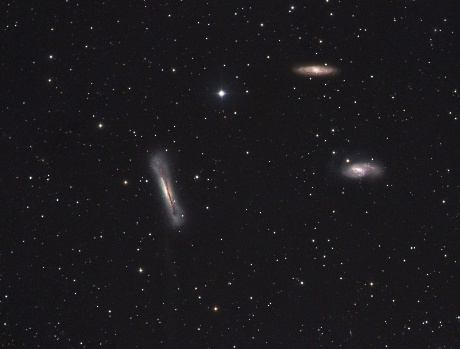 Das Bild zeigt das berühmte Leo-Triplett im Sternbild Löwe. "Unterhalb" von NGC3628 (linke Galaxie) ist ein schwacher Gezeitenschweif zu erkennen.