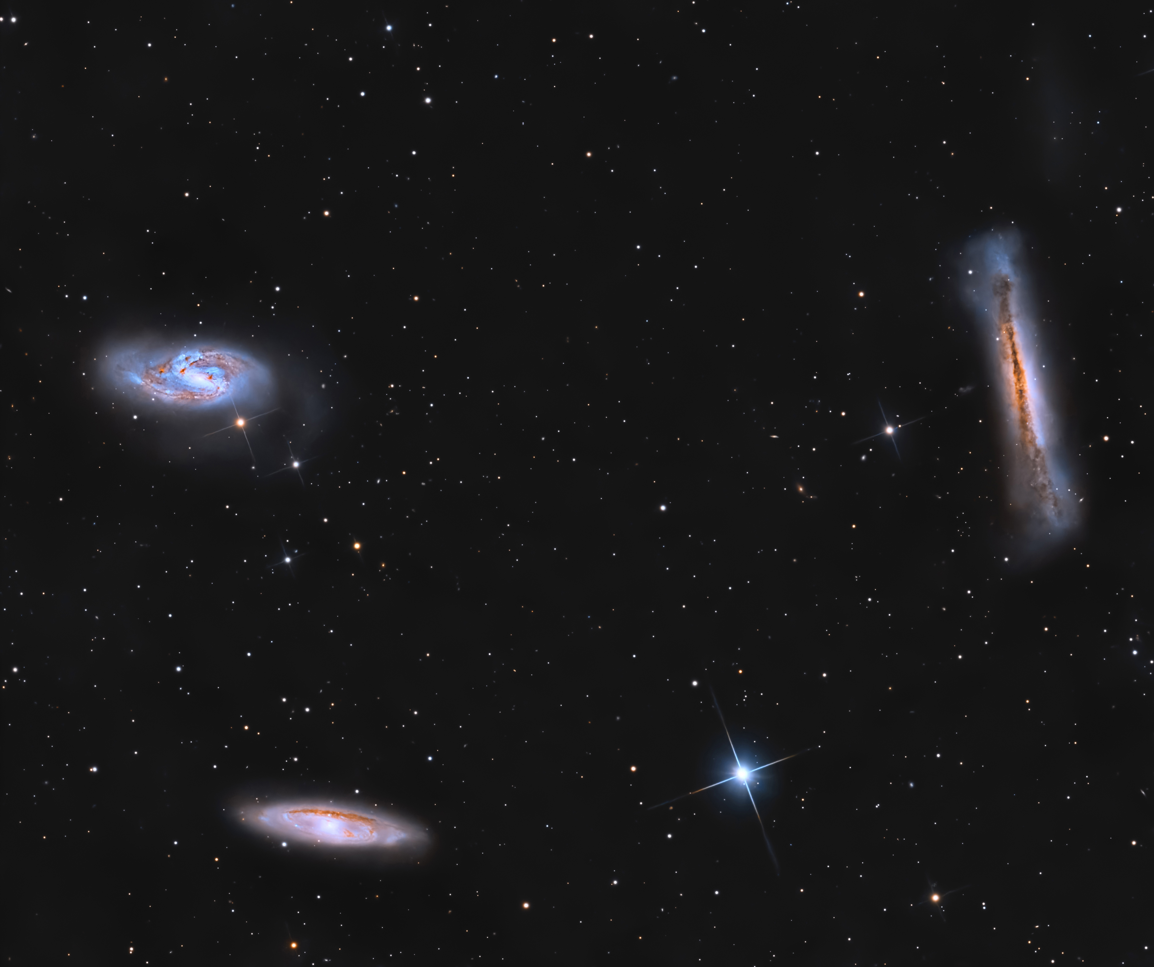 Das Leo-Triplett (bestehend aus M 65, M 66 und NGC 3628), auch bekannt als M66-Gruppe, ist eine kleine Ansammlung von Galaxien, die bekanntermaßen gravitativ miteinander wechselwirken. M 65 (auch bekannt als NGC 3623) ist eine Spiralgalaxie in etwa 35 Millionen Lichtjahren Entfernung mit einer scheinbaren Helligkeit von 10,25. Ihre Spiralarme werden von einem System aus dunklem Staub durchzogen, in dem auf hochauflösenden Bildern sehr helle blaue Sterne zu erkennen sind – ein Zeichen für Sternentstehung. Ihr tatsächlicher Durchmesser beträgt 70000 Lichtjahre, ihre Masse entspricht 85 Milliarden Sonnenmassen. Messier 65 wurde von Charles Messier entdeckt, doch William Herschel schrieb die Entdeckung in seinem Werk »Ein Zyklus himmlischer Objekte« fälschlicherweise Messiers Freund Pierre Méchain zu. Kenneth Glyn Jones bemerkte diesen Irrtum in den 1960er Jahren. Messier entdeckte M 65 am 1. März 1780. M 66 (auch bekannt als NGC 3627) ist eine intermediäre Spiralgalaxie und mit einer scheinbaren Helligkeit von 8,9 das hellste Mitglied des Tripletts. Die Galaxie ist etwa 36 Millionen Lichtjahre von uns entfernt und hat einen Radius von etwa 50000 Lichtjahren. M 66 ist bekannt für ihre auffälligen dunklen Staubbänder und hellen Starburst-Regionen entlang der Spiralarme. Die Gravitationswechselwirkung mit den nahegelegenen Galaxien M 65 und NGC 3628 hat M 66 erheblich beeinflusst. Die frühere Begegnung der Galaxie mit NGC 3628 führte zu einer extrem hohen zentralen Massenkonzentration, asymmetrischen Spiralarmen und einem Klumpen HI-Material, der aus einem der Spiralarme der Galaxie entfernt wurde. Infolgedessen scheint die Galaxie eine auffällige und ungewöhnliche Struktur aus Spiralarmen und Staubbändern aufzuweisen. Die Begegnung mit NGC 3628 vor etwa einer Milliarde Jahren beeinflusste beide Galaxien. Der Bulge von M66 wurde leicht aus dem Zentrum verschoben und ein 300000 Lichtjahre langer Sternenstrom aus NGC 3628 herausgerissen (auf diesem Bild nur teilweise sichtbar). Messier entdeckte M 66 am 1. März 1780. NGC 3628 (auch Hamburger-Galaxie genannt) ist das leuchtschwächste, aber mit einer scheinbaren Helligkeit von 10,4 mag das größte Mitglied des Tripletts. Es handelt sich um eine balkenlose Spiralgalaxie, die etwa 35 Millionen Lichtjahre von uns entfernt ist. Ihr auffälligstes Merkmal ist das breite dunkle Staubband am äußeren Rand ihrer Spiralarme. Das dritte Mitglied der M 66-Gruppe, NGC 3628, wurde erst am 8. April 1784 entdeckt, als Wilhelm Herschel es mit seinem Teleskop entdeckte, das deutlich größer war als das von Messier.