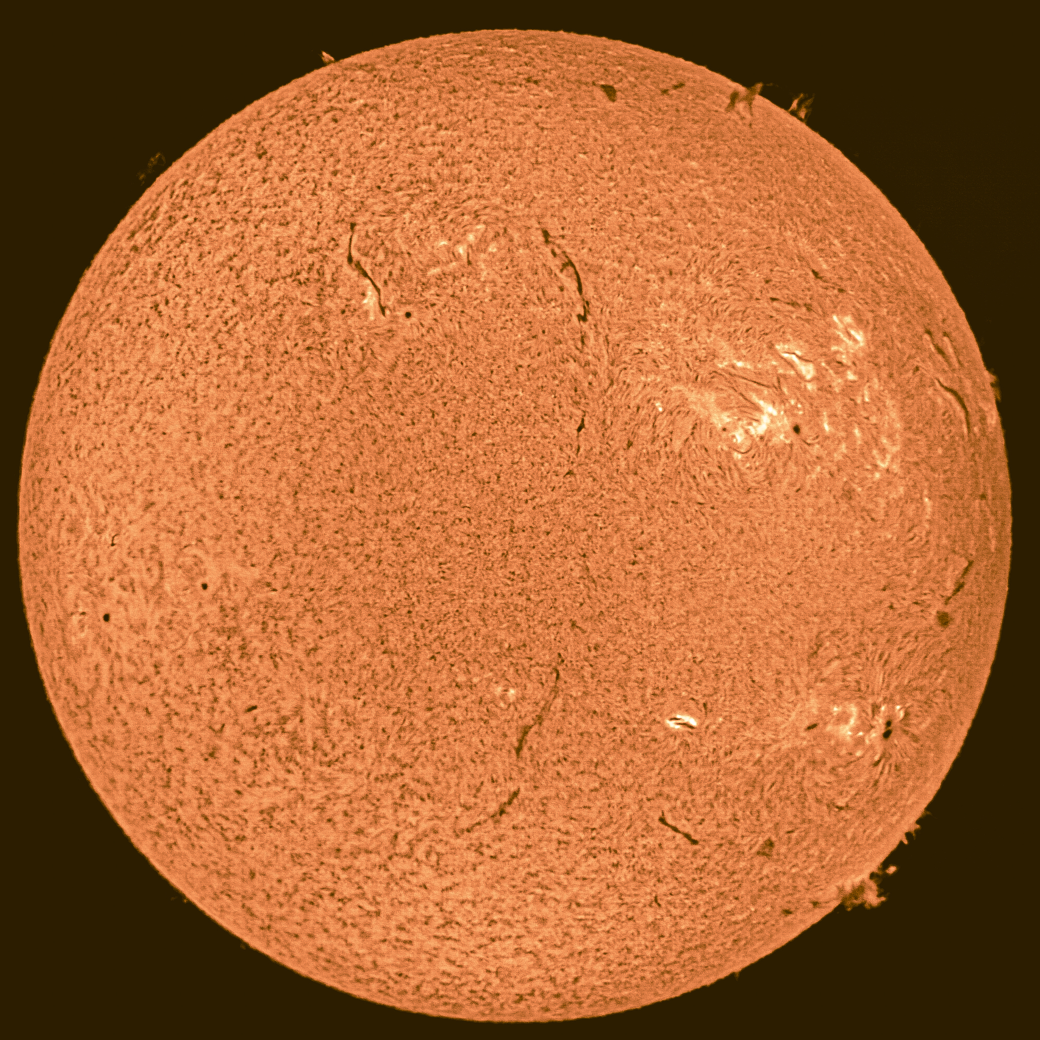 Sonnenaktivität zum Jahresende 2022. Gegen 12 Uhr konnte ich die wahrscheinlich letzten H-Alpha-Aufnahmen der Sonne in diesem Jahr machen. 20° über dem Horizont, viele Bäume und Dächer begrenzten den Aufnahmezeitraum auf etwa 20 Minuten. Zum Glück war der Himmel in der Region Hannover genau zu dieser Zeit wolkenlos. Man sieht zum Jahresende, dass wir im Sonnenzyklus in den nächsten zwei bis drei Jahren auf »ein vielversprechendes« Maximum zugehen.
