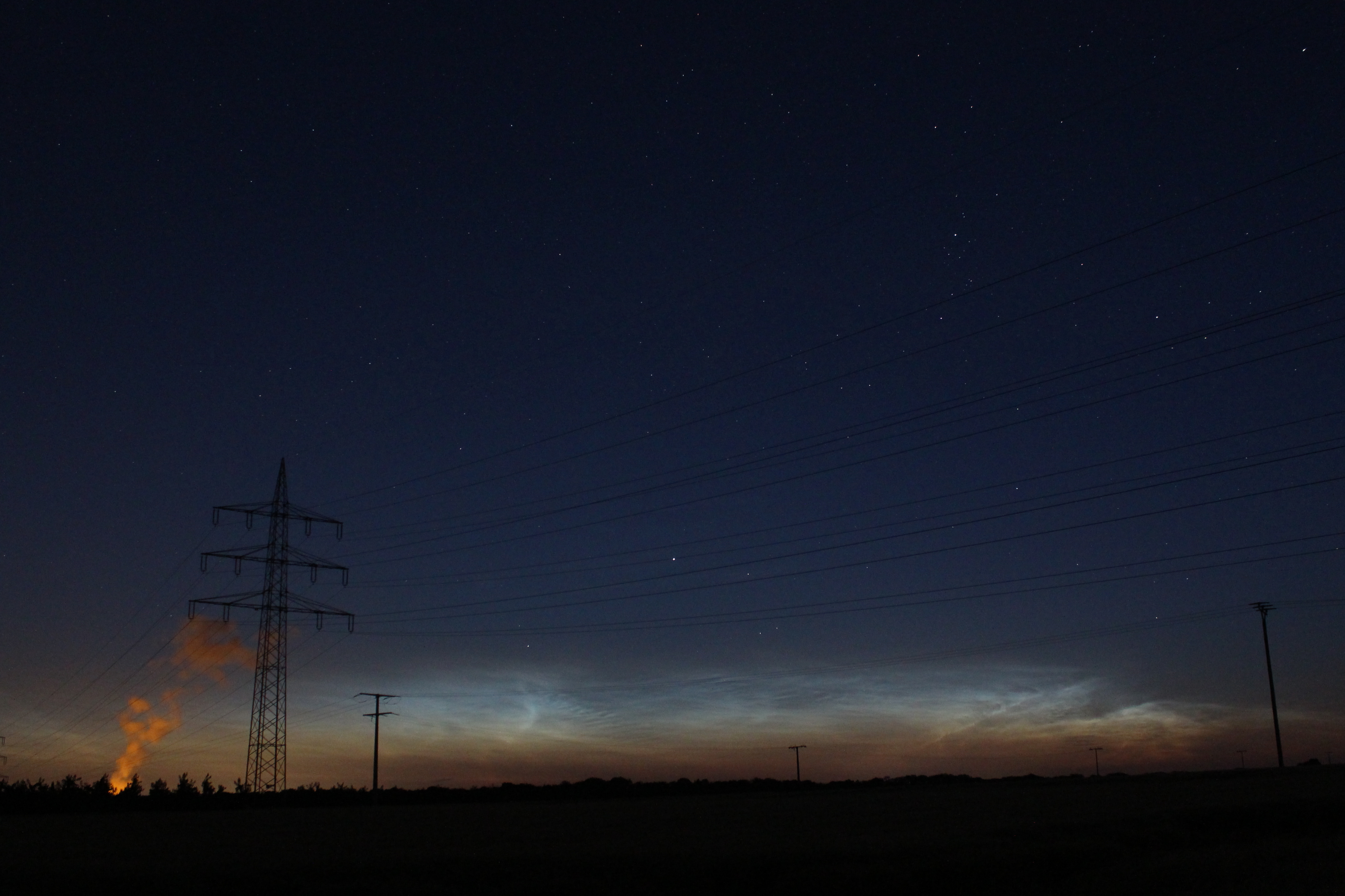 Schon seit einigen Tagen halte ich Ausschau nach leuchtenden Nachtwolken: am Morgen des 23. Juni 2018 hatte ich Erfolg und konnte von der Zufahrt zur Windkraftanlage Ingersheim in nordwestlicher Richtung solche in nordwestlicher Richtung beobachten und fotografieren. Man erkennt auch die Sternbilder Fuhrmann und Perseus auf dem Bild. Die Wolken, die links von dem Mast aufsteigen stammen vom Kernkraftwerk Neckarwestheim.