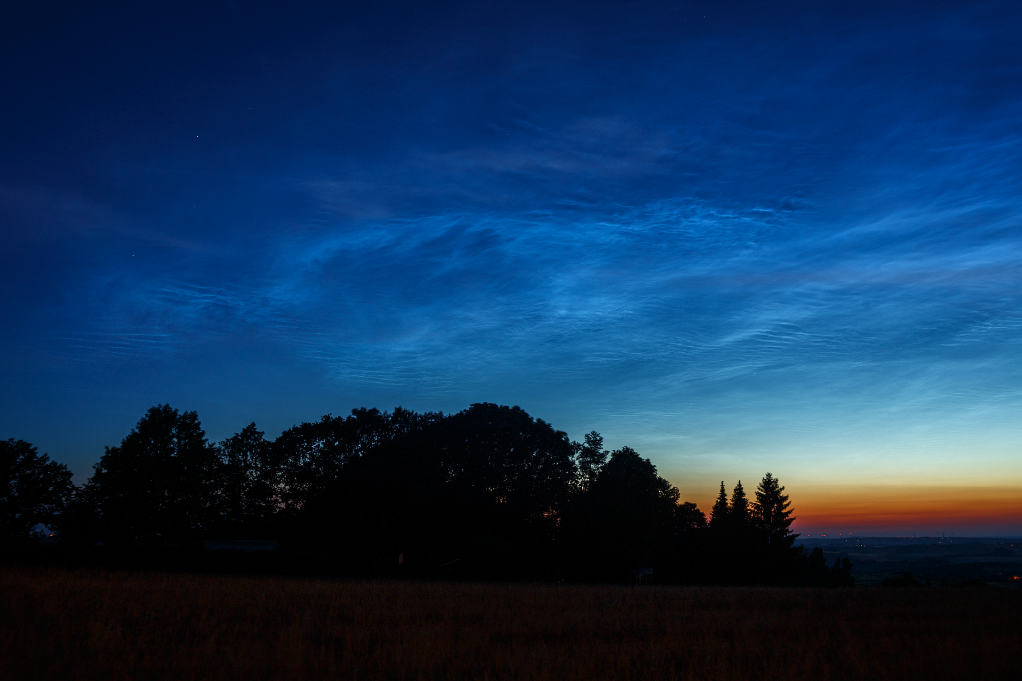 Was für eine Nacht vom 17. auf den 18. Juni: Leuchtende Nachtwolken, NLCs, wie sie selten so in dieser Ausdehnung (Azimut) und Höhe beobachtet wurden! Ich fuhr gegen 22 Uhr auf den Landberg bei Herzogswalde am Rande des Tharandter Waldes, weil ich annahm, freie Horizontsicht gen Nord. Weit gefehlt! Schon in großer Höhe zeichneten sich die typischen Rippen ab. Eine Höhenmessung ergab sodann um die 50°! Auch das Azimut, besonders in Richtung West, konnte sich sehen lassen: 280°. Bis 40° gen Ost war das Feld zu sehen! Scharfe Linien, Wellen, Rippen. NLCs - für mich die "Polarlichter" des Sommers. Auch hier geht in der Regel der Blick nach Nord… An Faszination absolut ebenbürtig! Das Morgendisplay, ebenso eindrucksvoll, konnte ich aus beruflichen Gründen nicht mitnehmen … Dafür entschädigte der Abend mehr als genug!