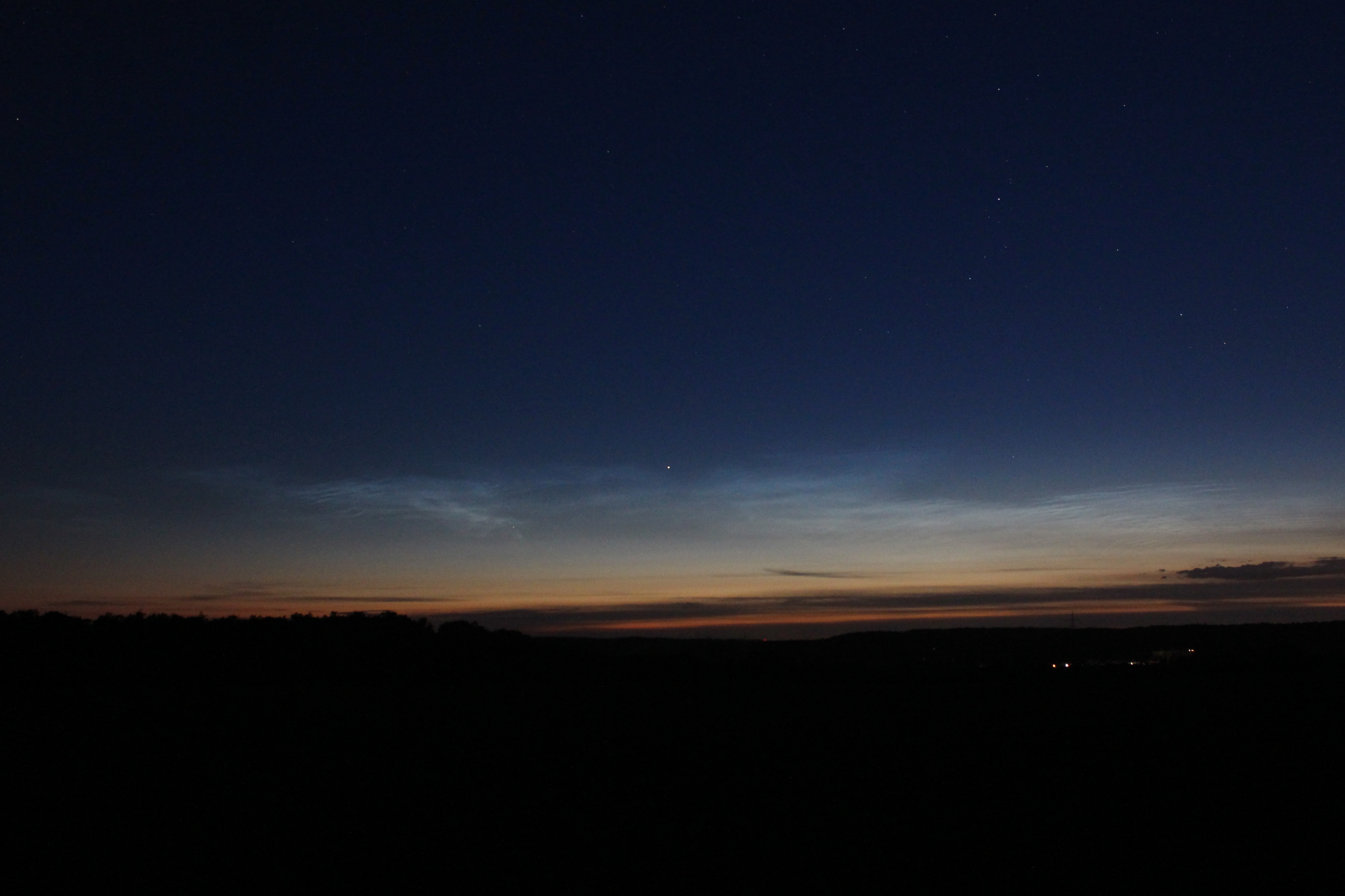 Meine erste Sichtung leuchtender Nachtwolken 2020, aufgenommen von einem Feldweg westlich des Sindelfinger Ortsteils Maichingen. Der helle Stern ist Kapella im Fuhrmann.