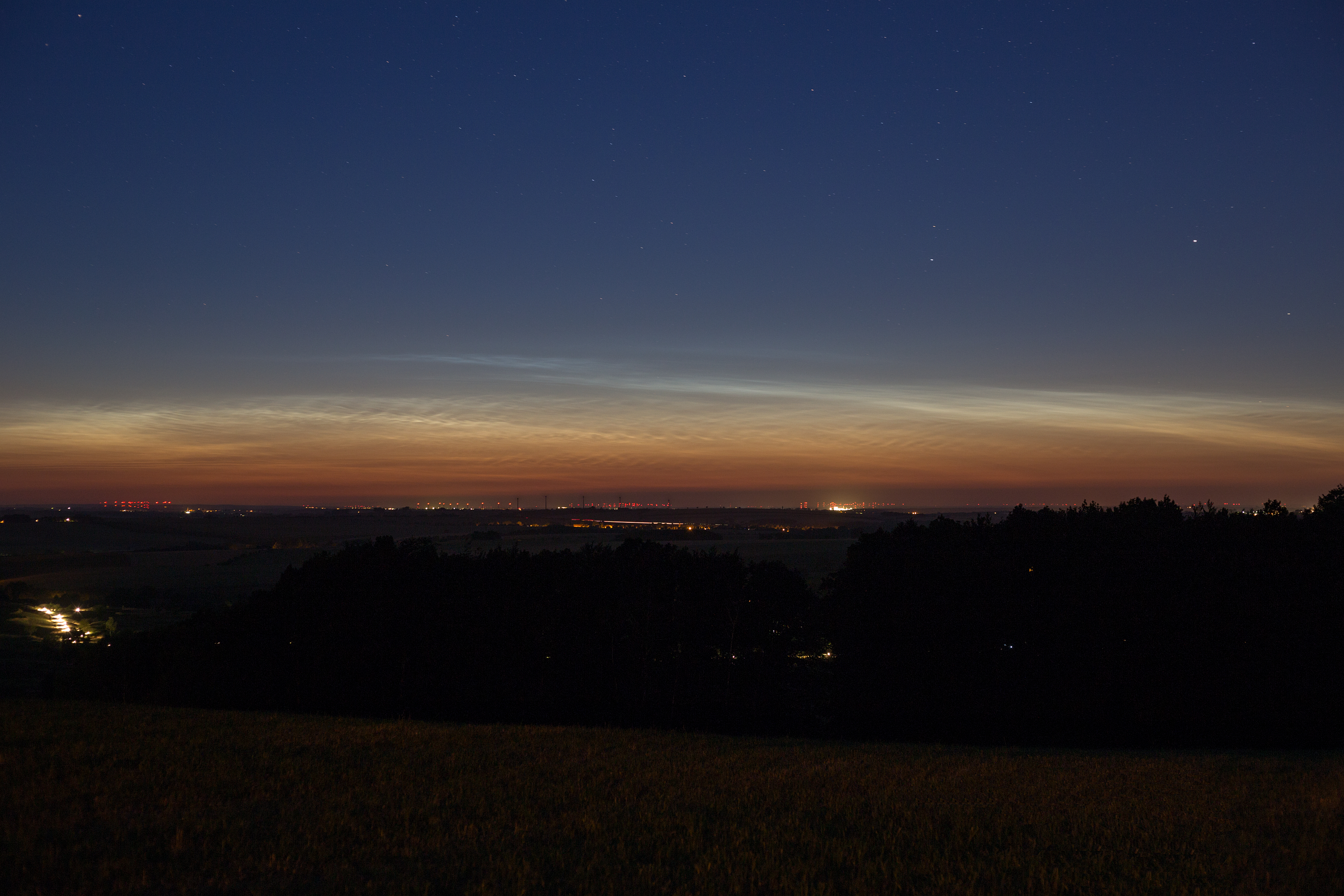 Kurz vor Mitternacht am 27. Juni 2019 entstand diese Gesamtaufnahme des NLC-Feldes über dem Nordhorizont. Es war reich strukturiert, aber trotz seiner Höhe von nur vier Grad dafür sehr ausgedehnt.