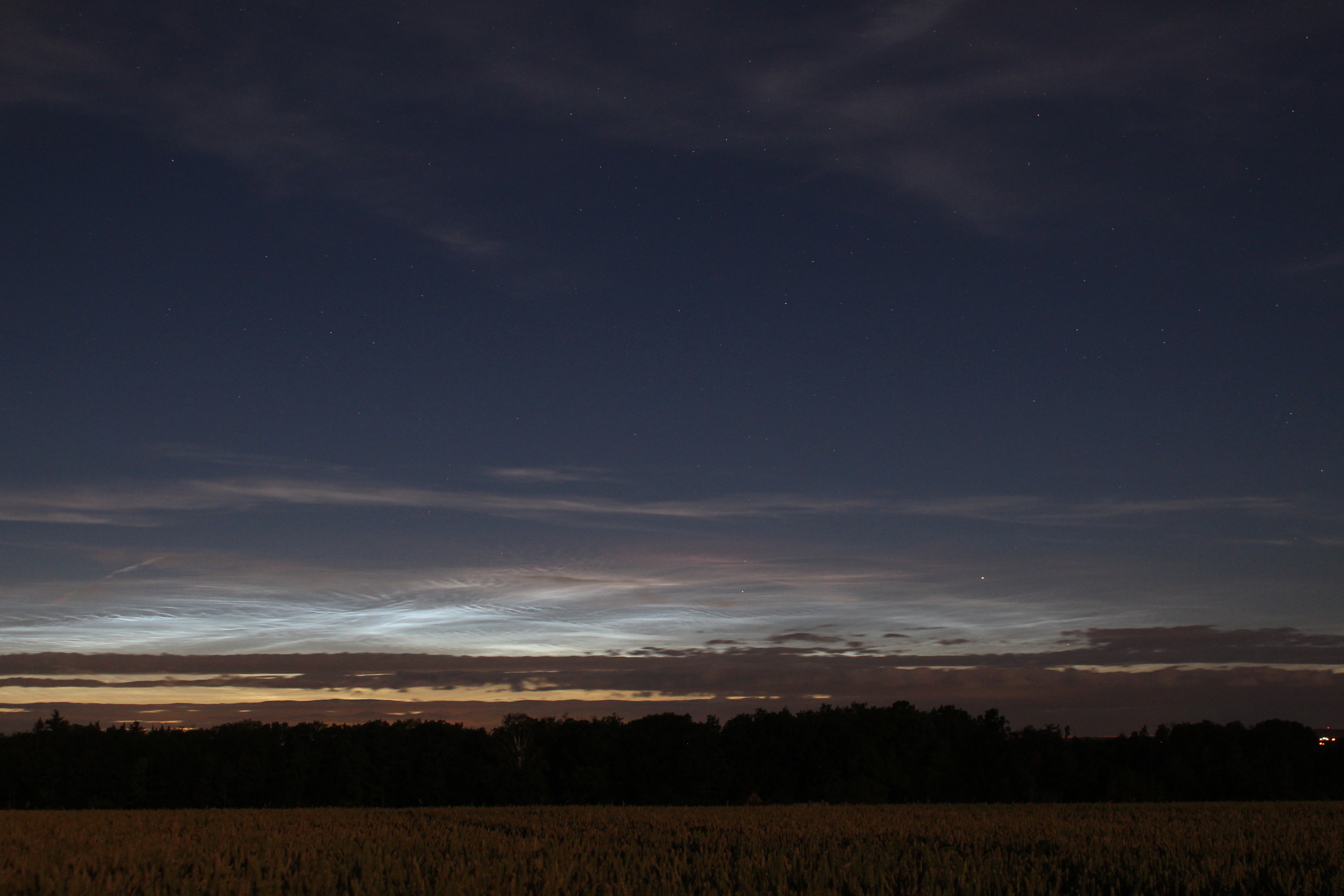 Leuchtende Nachtwolken über dem Nordhorizont, aufgenommen westlich des Sindelfinger Ortsteils Maichingen.