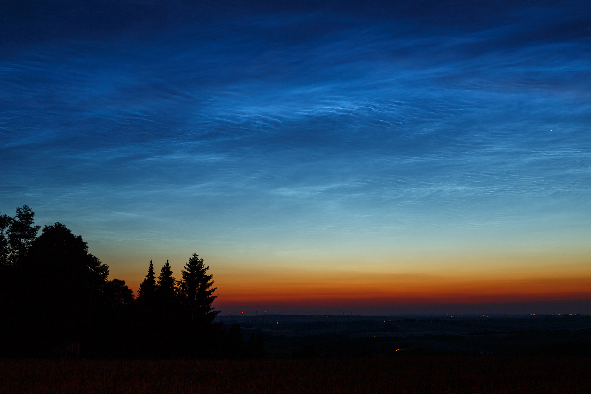 Was für eine Nacht vom 17. auf den 18. Juni: Leuchtende Nachtwolken, NLCs, wie sie selten so in dieser Ausdehnung (Azimut) und Höhe beobachtet wurden! Ich fuhr gegen 22 Uhr auf den Landberg bei Herzogswalde am Rande des Tharandter Waldes, weil ich annahm, freie Horizontsicht gen Nord. Weit gefehlt! Schon in großer Höhe zeichneten sich die typischen Rippen ab. Eine Höhenmessung ergab sodann um die 50°! Auch das Azimut, besonders in Richtung West, konnte sich sehen lassen: 280°. Bis 40° gen Ost war das Feld zu sehen! Scharfe Linien, Wellen, Rippen. NLCs - für mich die "Polarlichter" des Sommers. Auch hier geht in der Regel der Blick nach Nord… An Faszination absolut ebenbürtig! Das Morgendisplay, ebenso eindrucksvoll, konnte ich aus beruflichen Gründen nicht mitnehmen … Dafür entschädigte der Abend mehr als genug!
