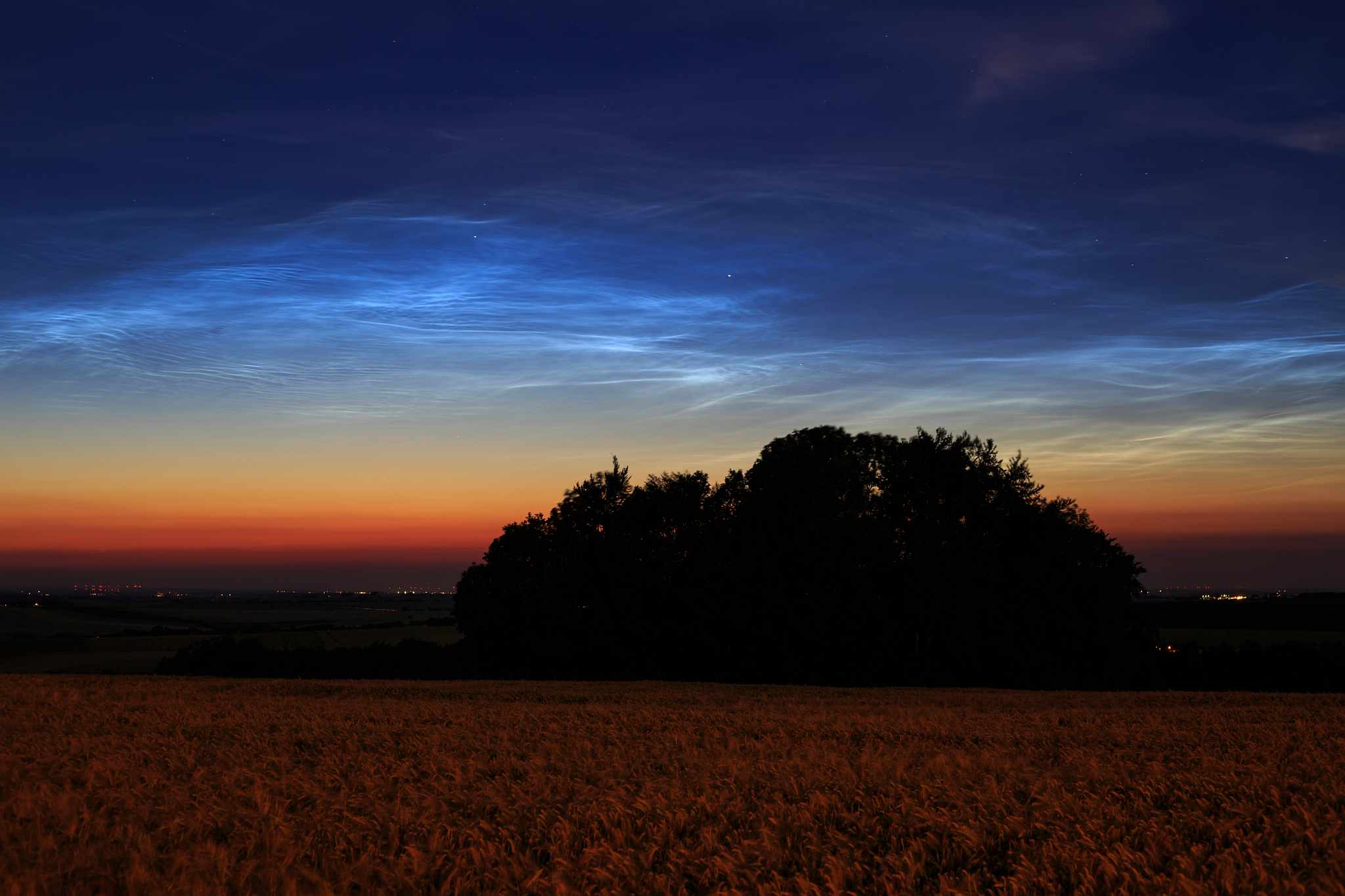 Was für eine Nacht vom 17. auf den 18. Juni: Leuchtende Nachtwolken, NLCs, wie sie selten so in dieser Ausdehnung (Azimut) und Höhe beobachtet wurden! Ich fuhr gegen 22 Uhr auf den Landberg bei Herzogswalde am Rande des Tharandter Waldes, weil ich annahm, freie Horizontsicht gen Nord. Weit gefehlt! Schon in großer Höhe zeichneten sich die typischen Rippen ab. Eine Höhenmessung ergab sodann um die 50°! Auch das Azimut, besonders in Richtung West, konnte sich sehen lassen: 280°. Bis 40° gen Ost war das Feld zu sehen! Scharfe Linien, Wellen, Rippen. NLCs - für mich die "Polarlichter" des Sommers. Auch hier geht in der Regel der Blick nach Nord… An Faszination absolut ebenbürtig! Das Morgendisplay, ebenso eindrucksvoll, konnte ich aus beruflichen Gründen nicht mitnehmen … Dafür entschädigte der Abend mehr als genug!