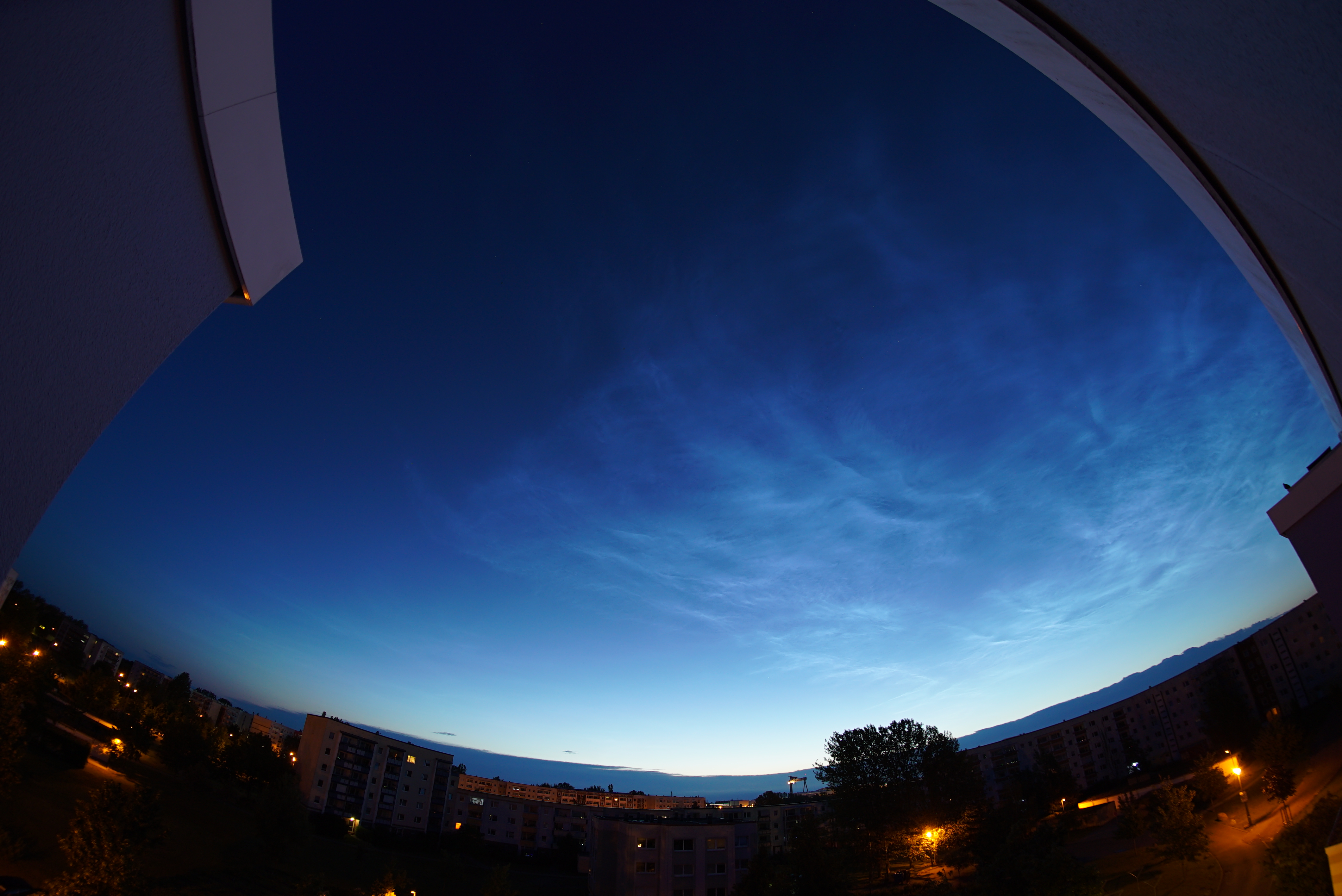 Der Himmel macht es immer spannend! Nachdem am Abend eine ungeplante Gewitterlinie den freien Blick auf frühabendliche NLC verhinderte, bot der Morgenhimmel am 14. Juni 2019 ein wahrhaftes Schauspiel über Rostock. Im Nordosten krochen die NLC zunächst über eine noch recht markante Wolkenbank und waren schon sehr deutlich sichtbar. Das intensivierte sich noch mit zunehmender Dämmerung, bis bald der ganze Himmel von ihnen bedeckt erschien! Einen Eindruck vermag das Bild zu vermitteln, welches mit einem starken Weitwinkel (Fisheye) bei etwa größter Helligkeit aufgenommen worden ist. Sterne bieten Orientierung: Der Polarstern (54°N) liegt etwa links oberhalb der Bildmitte. Rechts, mitten in den NLC ist Cassiopeia auszumachen und links der Große Wagen. Die rechte Dachkante beschreibt etwa den Azimut 90°.