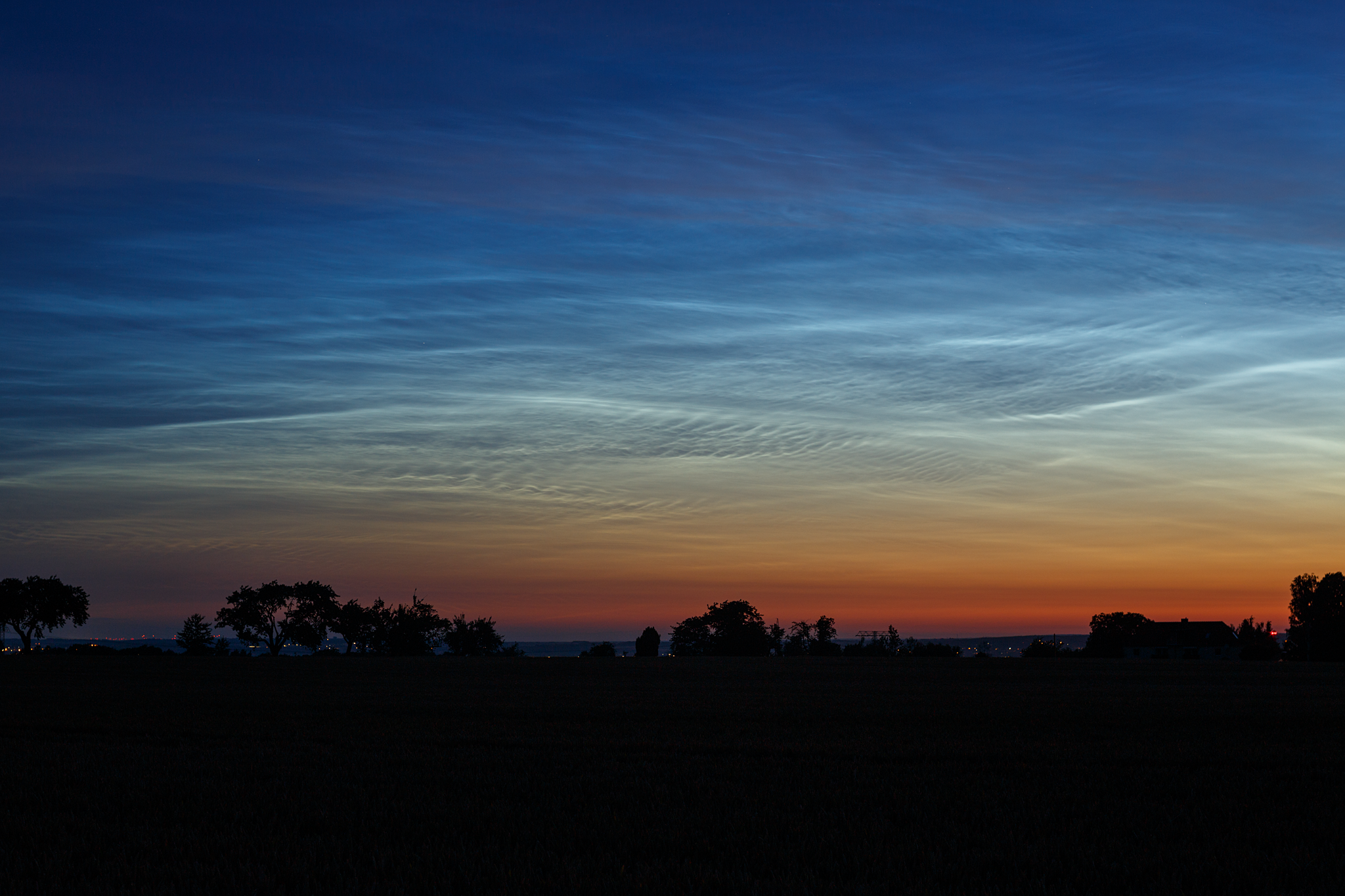 Nach längerer Pause (letzte Sichtung meinerseits am Morgen des 21. Juni) gab es heute morgen am 5. Juli 2022 wieder wunderschöne Leuchtende Nachtwolken zu beobachten. Der Abendsektor war noch leer, nach Mitternacht stiegen sie in rasanter Entwicklung über dem Nordhorizont auf. Über Freital lag noch eine dichtere Schicht Cirruswolken, so dass ich etwa 12 km gen Norden gefahren bin.
