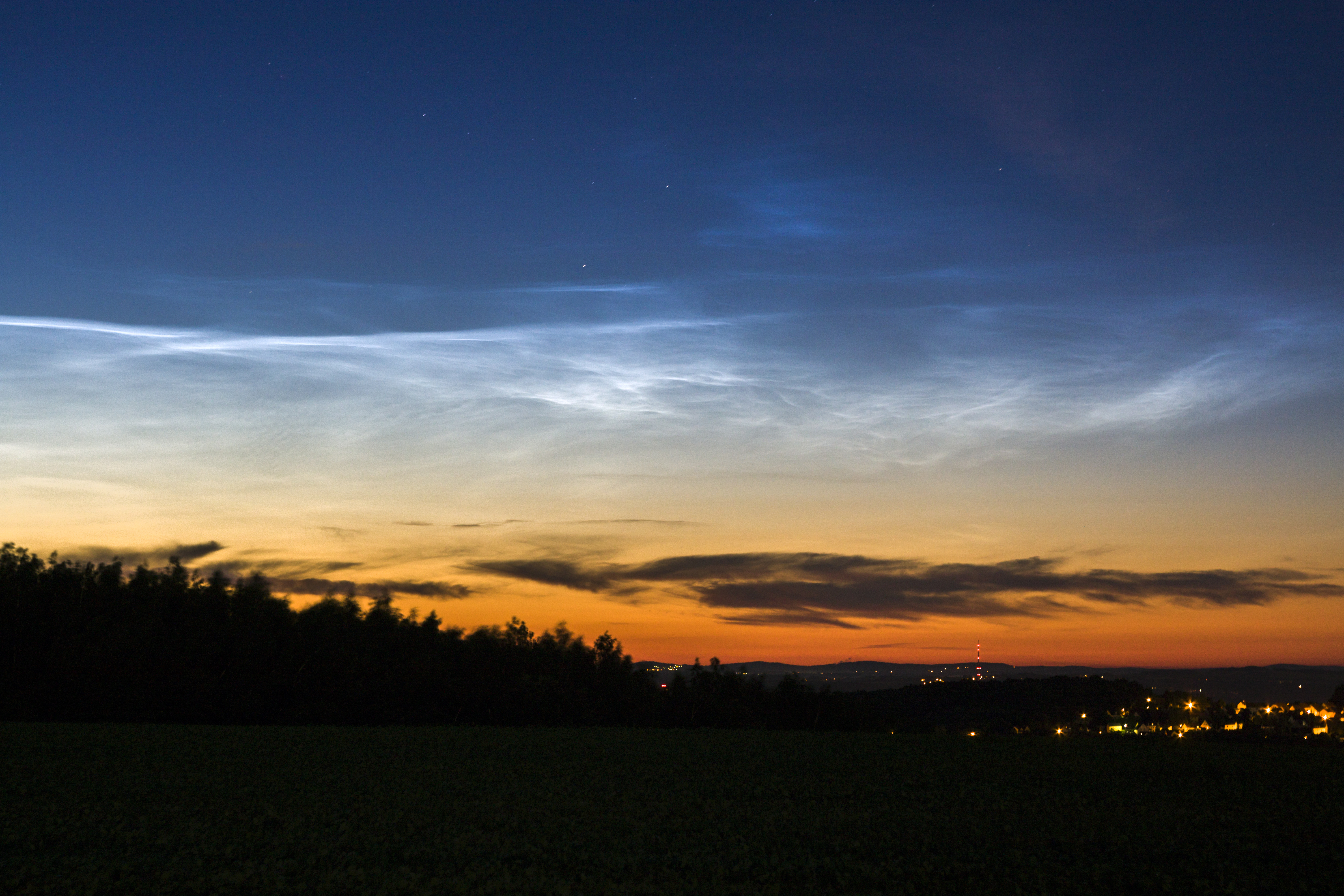 Zu lauen Sommernächten in den Monaten Mai bis August gehören zweifellos – in ihrem geheimnisvoll kaltmetallisch – blauem Licht leuchtende Wolken über dem Nordhorizont: Leuchtende Nachtwolken (NLCs). Diese zauberhaften Erscheinungen der Mesopause fesseln stets aufs neue den Beobachter. Die Saison 2016 begann recht früh mit einem Paukenschlag in der Nacht vom 18. auf den 19. Juni 2016: nachdem im Forum des AKM e.V. bereits Diskussionen darüber liefen – auf Grund der Daten im Netz – fuhr ich abends auf den Landberg bei Herzogswalde und konnte in der Tat ein kleines Display ausfinding machen. Jedoch war selbiges noch recht schwach und horizontnah. Also blieb ich die Nacht über wach und wartete gespannt auf das Morgendisplay… und es hat sich gelohnt! Die NLC-Aktivität stieg rapide an und wurde mit einem traumhaften Display belohnt. Sehr viele Formen und Strukturen waren zu sehen: Linien, Knoten, Wellen, kurze Striche… und das Wetter der Troposphäre passte auch. Für das Morgendisplay fuhr ich dann auf den Lerchenberg bei Börnchen, wo diese eindrucksvollen Bilder entstanden. Ich beobachte systematisch seit 1998 NLCs im Beobachternetzwerk mit…