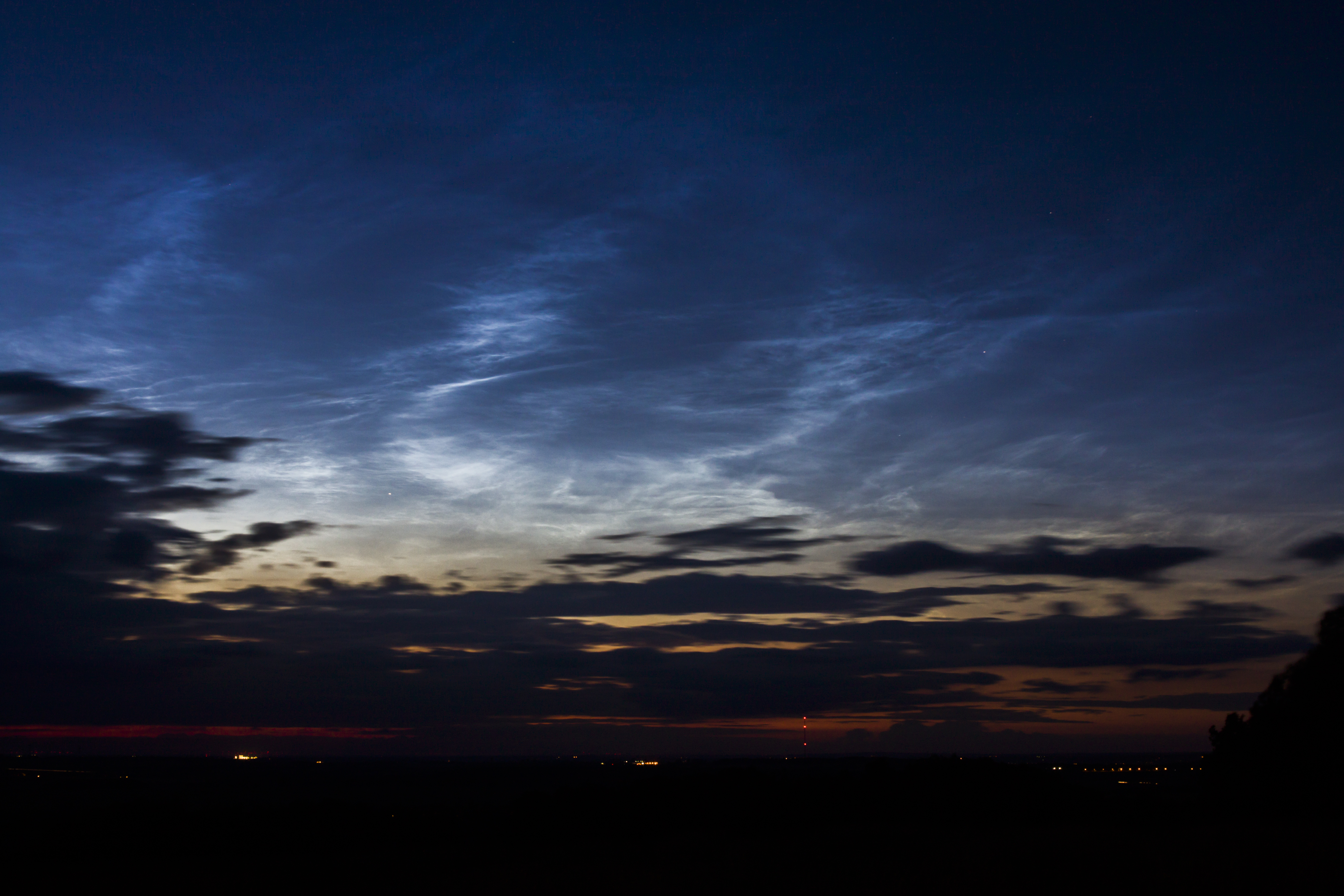 Die NLC-Saison 2016 entwickelt sich kräftig. Der Juli ist der Hochmonat dieser zauberhaften Mesopausenwolken. Am Abend des 5. Juli 2016 fuhr ich in der noch sehr hellen Dämmerung auf den 426 Meter hohen Landberg bei Herzogswalde in Sachsen. Um mir die Zeit zu vertreiben, hatte ich mein Funkgerät mit und hatte noch einige nette Verbindungen im Amateurfunk. Die Sonne sank tiefer und plötzlich zeigten sich in großer Höhe über dem Nordhorizont gegen den noch recht hellen Himmel die ersten zarten Linien und Rippen! Mein Puls stieg, ich musste meine Gespräche beenden, weil ich noch die Fotoausrüstung aufbauen musste. Das musste ein geniales Display werden! Und wurde es auch! Die Kumuluswolken bildeten zunächst einen grandiosen Kontrast zu den elektrisch blauen NLCs, hier wurde mir der Höhenunterschied bewußt! Im Verlaufe des Abends bedeckten die Kumuluswolken die NLCs komplett, aber der Höhepunkt war im Kasten! Dafür lohnt sich das Hobby Astronomie! Momente, die man nicht vergisst!