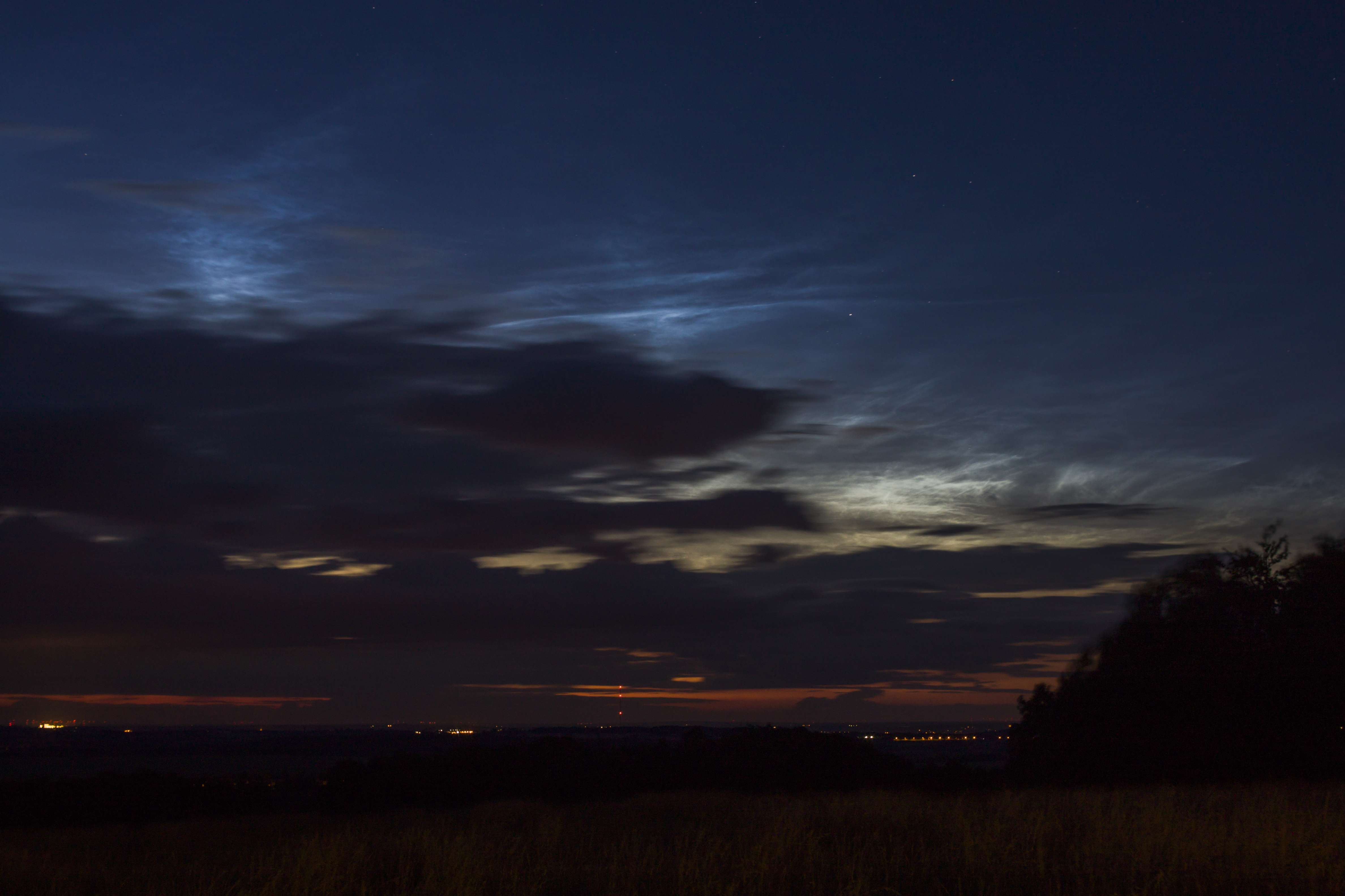 Die NLC-Saison 2016 entwickelt sich kräftig. Der Juli ist der Hochmonat dieser zauberhaften Mesopausenwolken. Am Abend des 5. Juli 2016 fuhr ich in der noch sehr hellen Dämmerung auf den 426 Meter hohen Landberg bei Herzogswalde in Sachsen. Um mir die Zeit zu vertreiben, hatte ich mein Funkgerät mit und hatte noch einige nette Verbindungen im Amateurfunk. Die Sonne sank tiefer und plötzlich zeigten sich in großer Höhe über dem Nordhorizont gegen den noch recht hellen Himmel die ersten zarten Linien und Rippen! Mein Puls stieg, ich musste meine Gespräche beenden, weil ich noch die Fotoausrüstung aufbauen musste. Das musste ein geniales Display werden! Und wurde es auch! Die Kumuluswolken bildeten zunächst einen grandiosen Kontrast zu den elektrisch blauen NLCs, hier wurde mir der Höhenunterschied bewußt! Im Verlaufe des Abends bedeckten die Kumuluswolken die NLCs komplett, aber der Höhepunkt war im Kasten! Dafür lohnt sich das Hobby Astronomie! Momente, die man nicht vergisst!