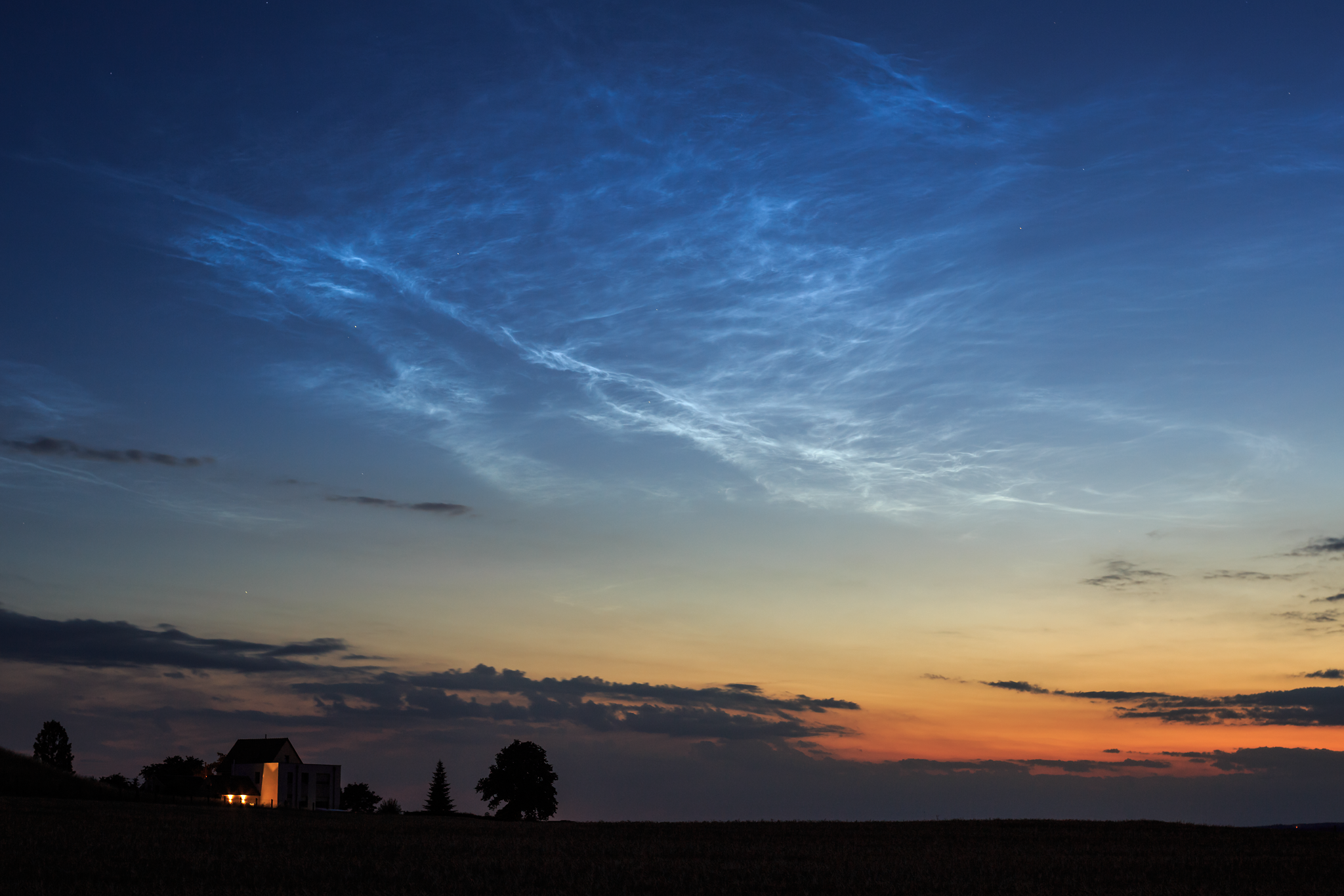 Die ersten NLCs wurden knapp nach Sonnenuntergang weit im Süden bei Spica in der Jungfrau sichtbar! Ein kleines, aber reich strukturiertes und helles Feld (Helligkeit: 3, Höhe fast 14°). Solche Tage/Abende muss man einfach genießen … Das bisher hellste Display der Saison hier, aufgenommen in Radebeul-Wahnsdorf in der Nähe der alten Wetterwarte.