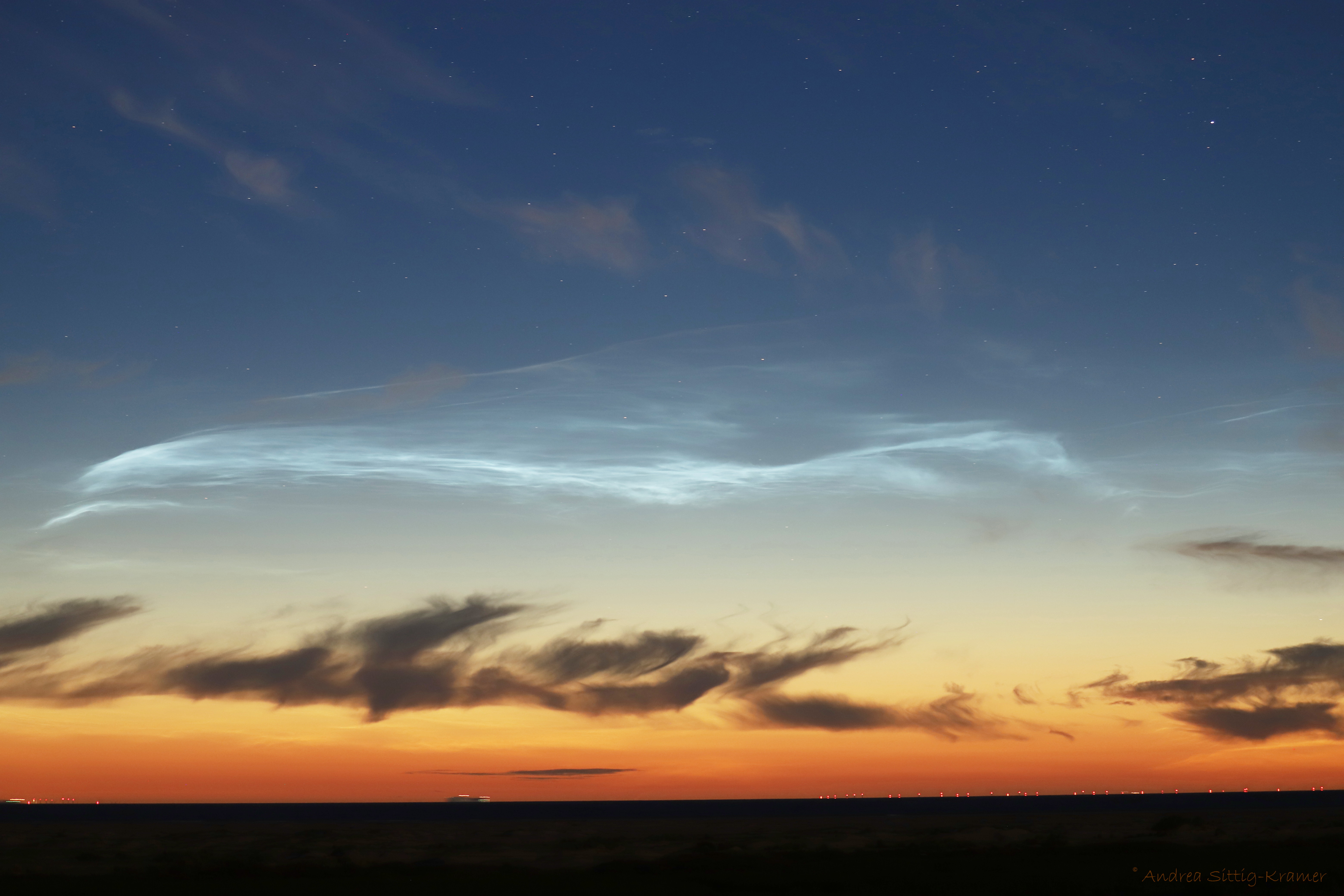 Die dritte Nacht in Folge konnte ich von Borkum aus leuchtende Nachtwolken beobachten. Ab kurz vor Mitternacht zeigten sich erste zarte Bänder knapp über dem Horizont. Sie wurden immer deutlicher, zogen immer höher hinauf und breiteten sich schließlich über den gesamten nördlichen Himmel aus. Nach gut drei Stunden lösten sich die silbrigen Wolken-Wellen wie von Zauberhand langsam wieder auf und wichen dem Morgenrot.