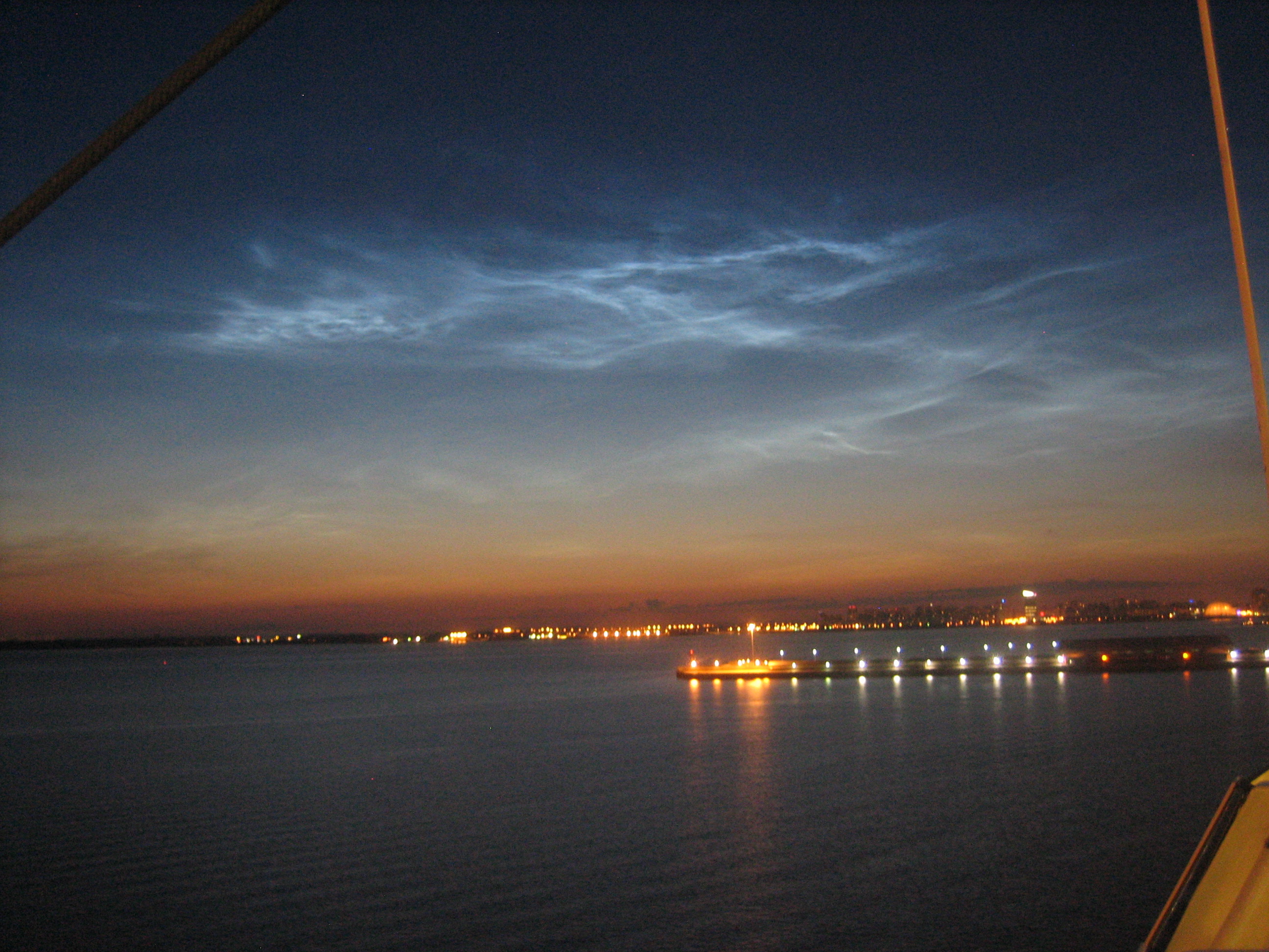 Mitte Juli neigt sich die Zeit der berühmten Weißen Nächte von St. Petersburg bereits ihrem Ende entgegen, dennoch wurde an diesem Abend ein später Spaziergang an Deck eines Kreuzfahrtschiffes (23:25 Uhr MESZ; 01:25 Uhr Ortszeit) mit einem stimmungsvollen Blick auf leuchtende Nachtwolken über dem Hafen der Metropole belohnt.