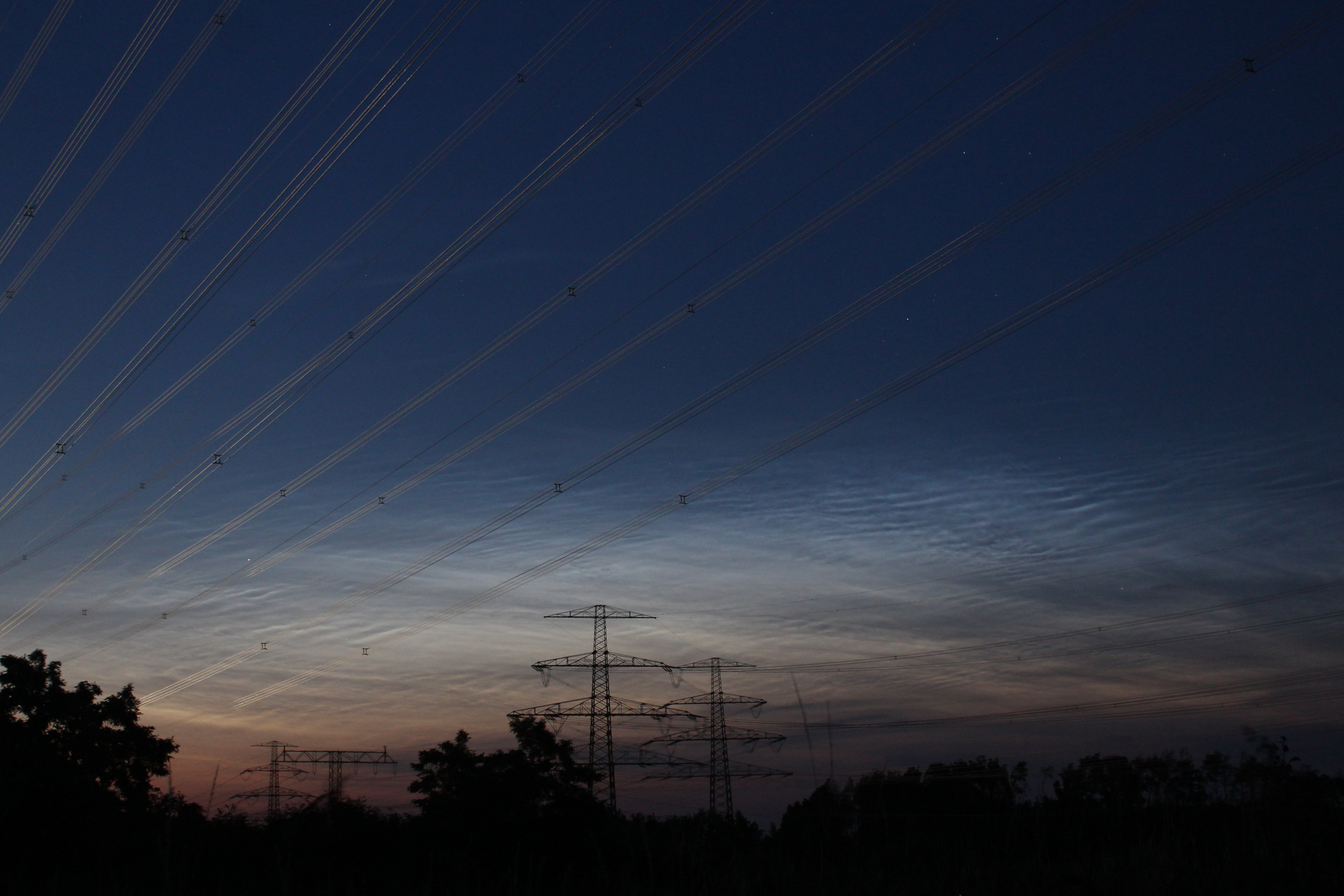 Leuchtende Nachtwolken über Neuenhagen, aufgenommen nördlich des Umspannwerks Neuenhagen. Die Straßenlampen eines nahe gelegenen Gewerbegebietes beleuchten teilweise die Seile der Stromleitung im Vordergrund.