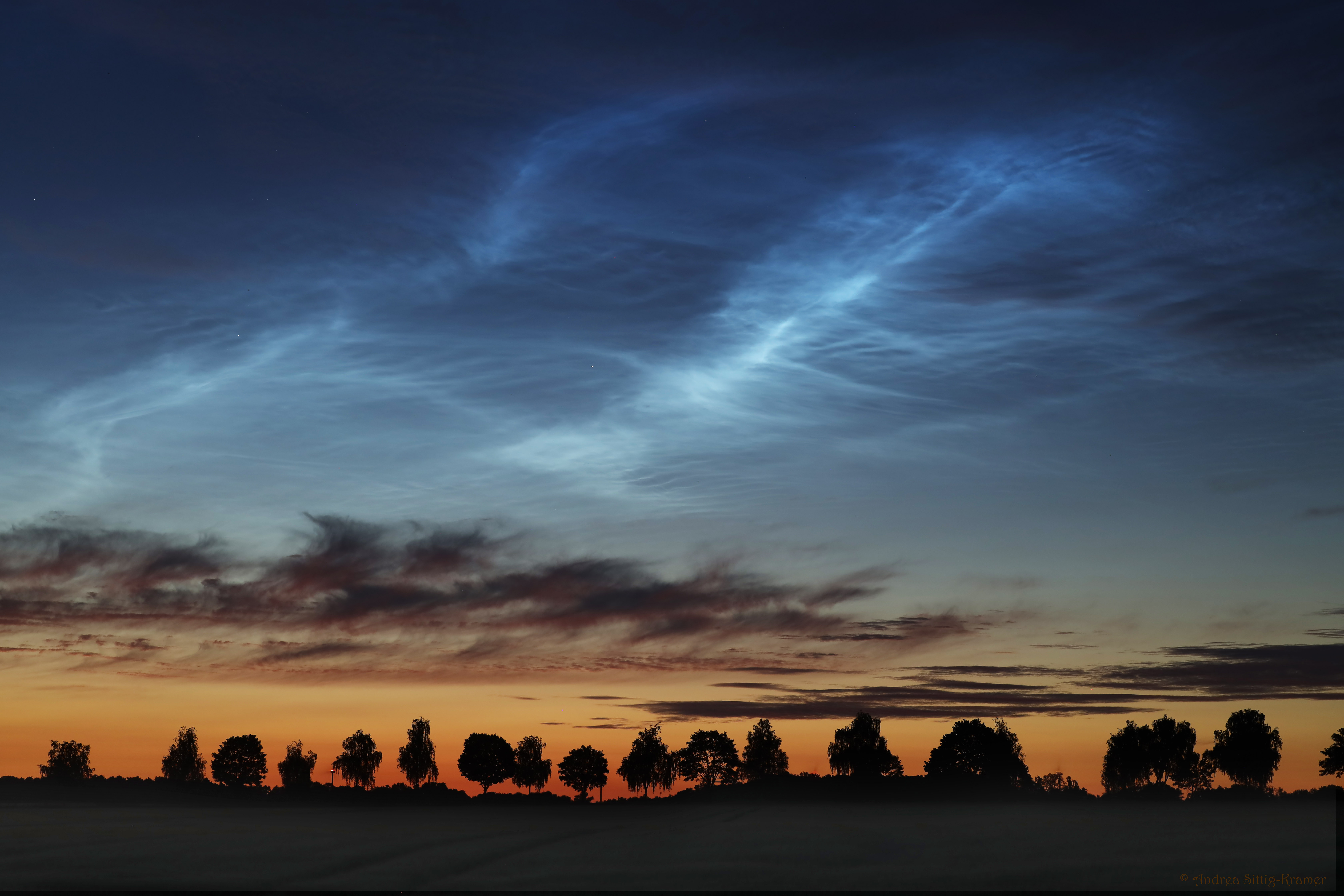 Eine halbe Stunde vor Mitternacht am 23. Juni 2024 stand die Sonne im Landkreis Uelzen etwa 10 Grad unter dem Horizont. Exakt die Bedingung, die notwendig ist, damit die Sonne die Eiskristalle in der Mesosphäre in rund 80 km Höhe anstrahlen und so zum Leuchten bringen kann. Für die Beobachtung dieser leuchtenden Nachtwolken suchte ich mir einen dunklen Standort mit freier Sicht zum nördlichen Horizont. Auf einem Feldweg, der parallel zu einer Bundesstraße verläuft, konnte ich die hell silbrig leuchtende atmosphärische Erscheinung fotografieren, beobachten und genießen.
