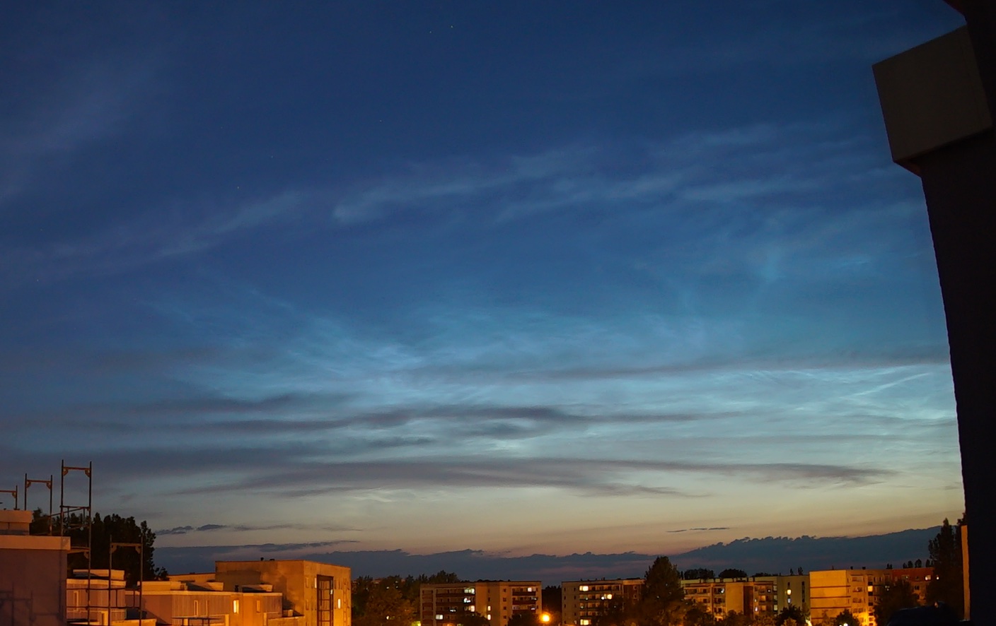 Nach dem die Nacht zuvor am Morgenhimmel über Rostock die leuchtenden Nahtwolken den ganzen Himmel bedeckten, wurden diese bereits sehr früh am Abend wieder sichtbar! Dieses Bild zeigt einen etwas späteren Anblick in nordwestlicher Richtung, als sich dieser Bereich intensivierte. Den Himmel zierten vielfach auch Zirren und anderes Gewölk, so daß die "NLC" es nicht ganz leicht hatten, sich durchzusetzen.