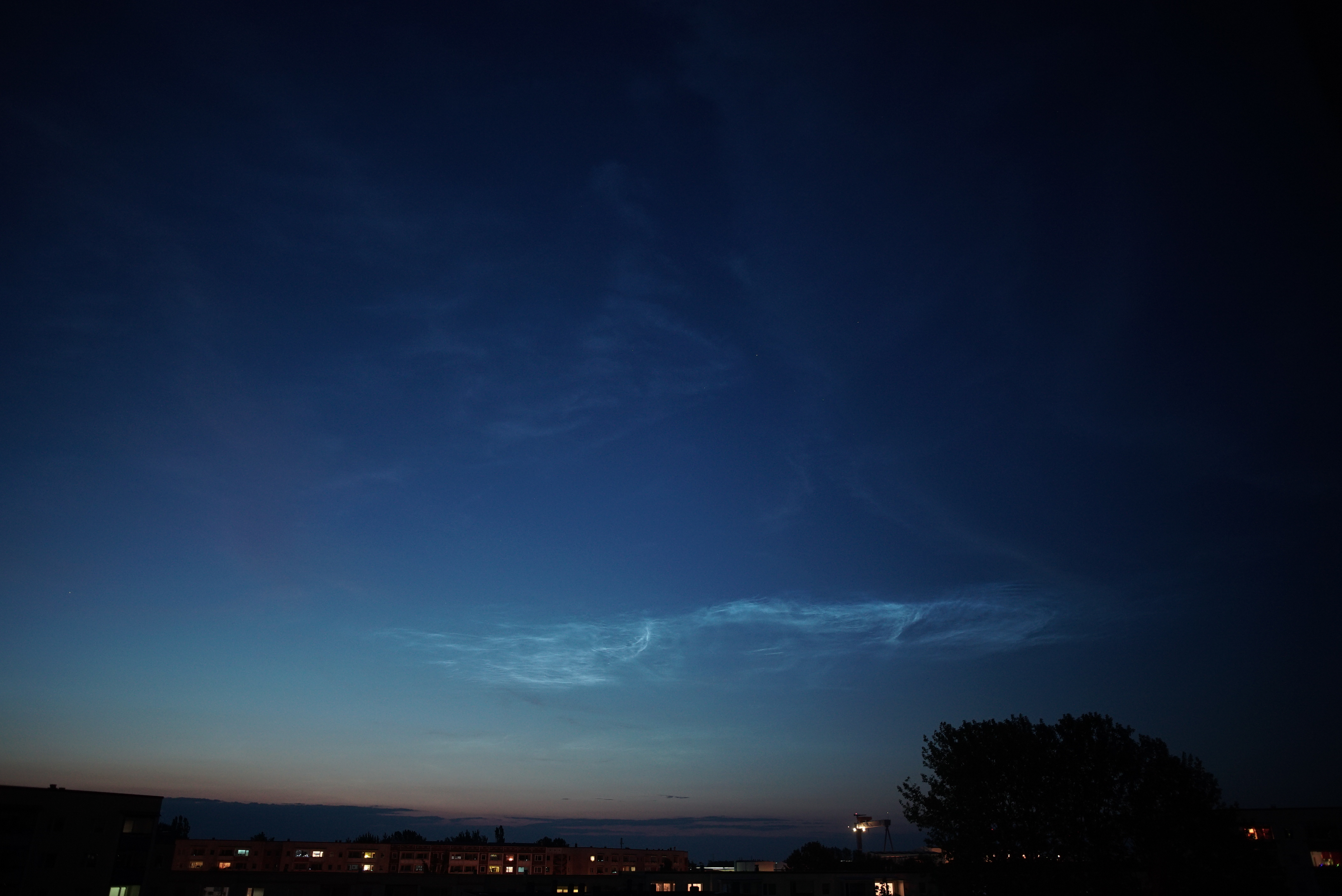 Nach dem die Nacht zuvor am Morgenhimmel über Rostock die leuchtenden Nahtwolken den ganzen Himmel bedeckten, wurden diese bereits sehr früh am Abend wieder sichtbar! Bereits um 20:32 Uhr UT konnte ich einige Streifen in der noch hellen Dämmerung in etwa 10° Höhe in Azimut 020-030 erspähen. Den Himmel zierten vielfach auch Zirren und anderes Gewölk, so dass nicht sicher war, wie hoch der Gesamtbedeckungsgrad sein könnte. Mit zunehmender Dunkelheit wurde der Anblick immer faszinierender!