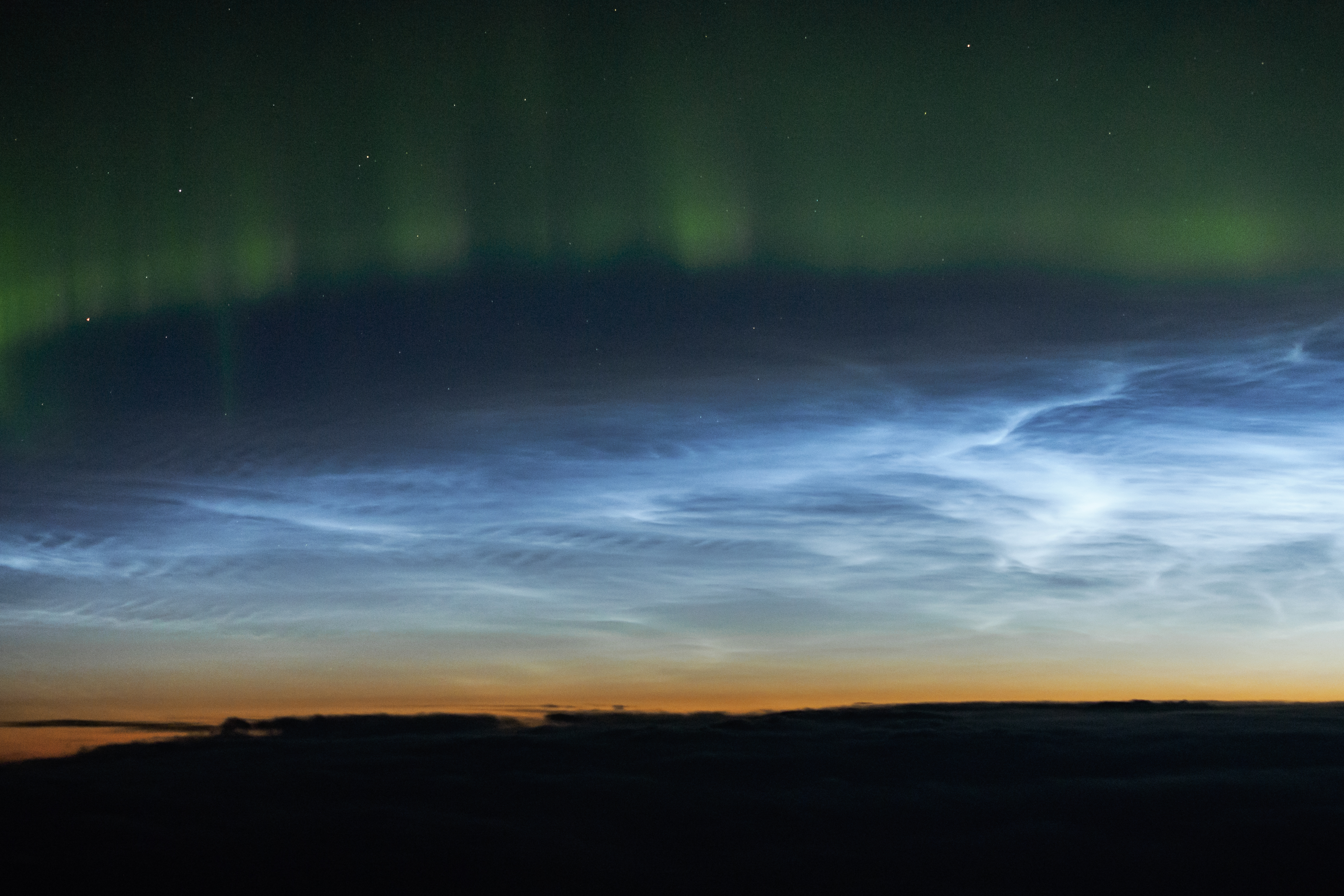 Auf einem Flug von Los Angeles nach München war für wenige Minuten über wunderschönen leuchtenden Nachtwolken trotz Mitternachtsdämmerung grünes Polarlicht zu sehen.