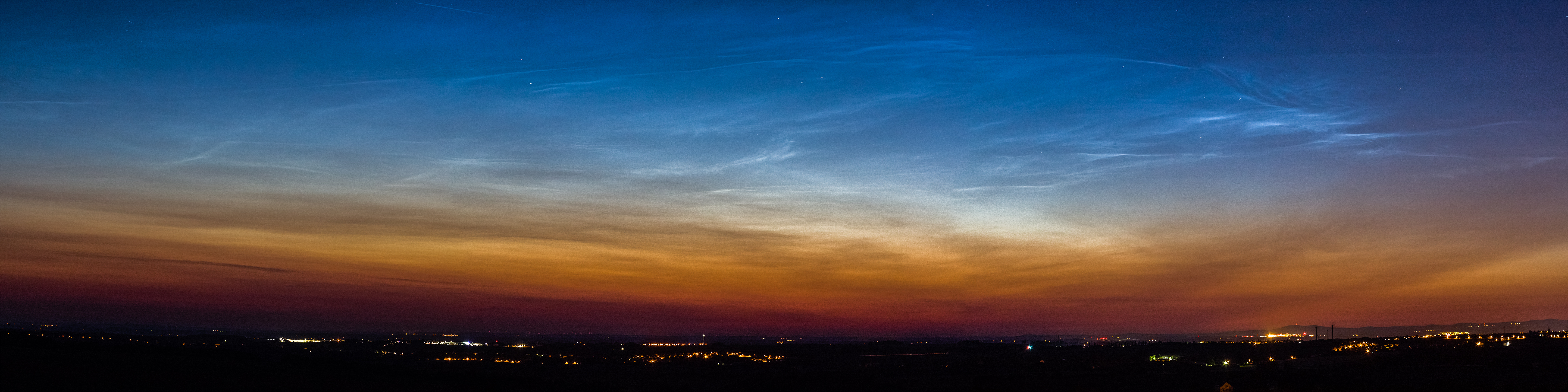 Nach einem etwas schwierigen Start in die diesjährige NLC-Saison (kurzzeitiger Anstieg der Temperatur in der Mesopause Anfang Juni) sank selbige schnell wieder ab und es konnten danach im Juni schon eindrucksvolle Displays leuchtender Nachtwolken beobachtet werden. So auch am Morgen des 20. Juni 2017 über Sachsen. Eindrucksvoll der Farbkontrast der elektrisch blau schimmernden NLCs und der dunklen Schleierwolken. Die Ausdehnung dieses Displays war bemerkenswert: es erstreckte sich über einen Azimutbereich von 340° bis 70° und erreichte eine Höhe von fast 15° über dem Nordhorizont. Kapella stand inmitten der NLCs! So entschloss ich mich, aus sieben RAW-Aufnahmen ein Panorama zu erstellen, was die gesamte Ausdehnung des NLC-Felds über dem Nordhorizont wiedergibt.