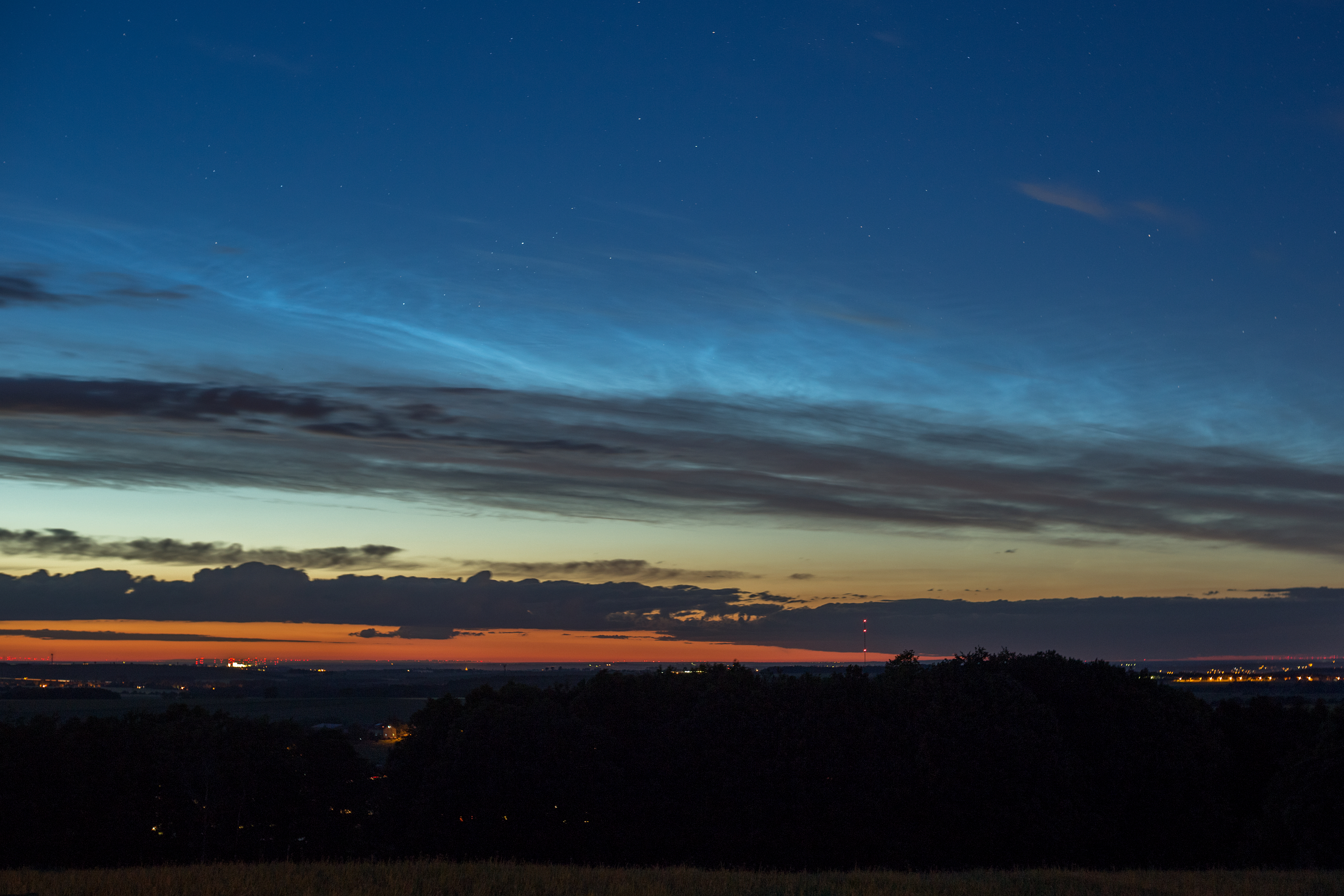 Am Abend des 6. Juni 2020 traf ich mich mit meinem Astrokollegen Ronny Rohloff auf dem Landberg bei Herzogswalde, um nach eventuellen NLCs Ausschau zu halten. Das Kühlungsborner OSWIN-Mesosphärenradar des IAP zeigte an diesem Tag ungewöhnlich starke Echos, so daß gute Hoffnungen bestanden, die faszinierenden Mesopausenwolken zu sehen. Tatsächlich zeigten sich mit zunehmender Sonntiefe die ersten elektrisch blauen Schleier aus 85 km Höhe. Zufällig fotografierte jeder mit seiner Technik (beide haben wir eine EOS 6D) und fast zur gleichen Uhrzeit ein NLC-Feld über einer troposphärischen Wolkenkante… Möge uns die Saison noch viele schöne NLC-Displays bescheren, auch wenn derzeit das Wetter nicht ganz dazu passt …