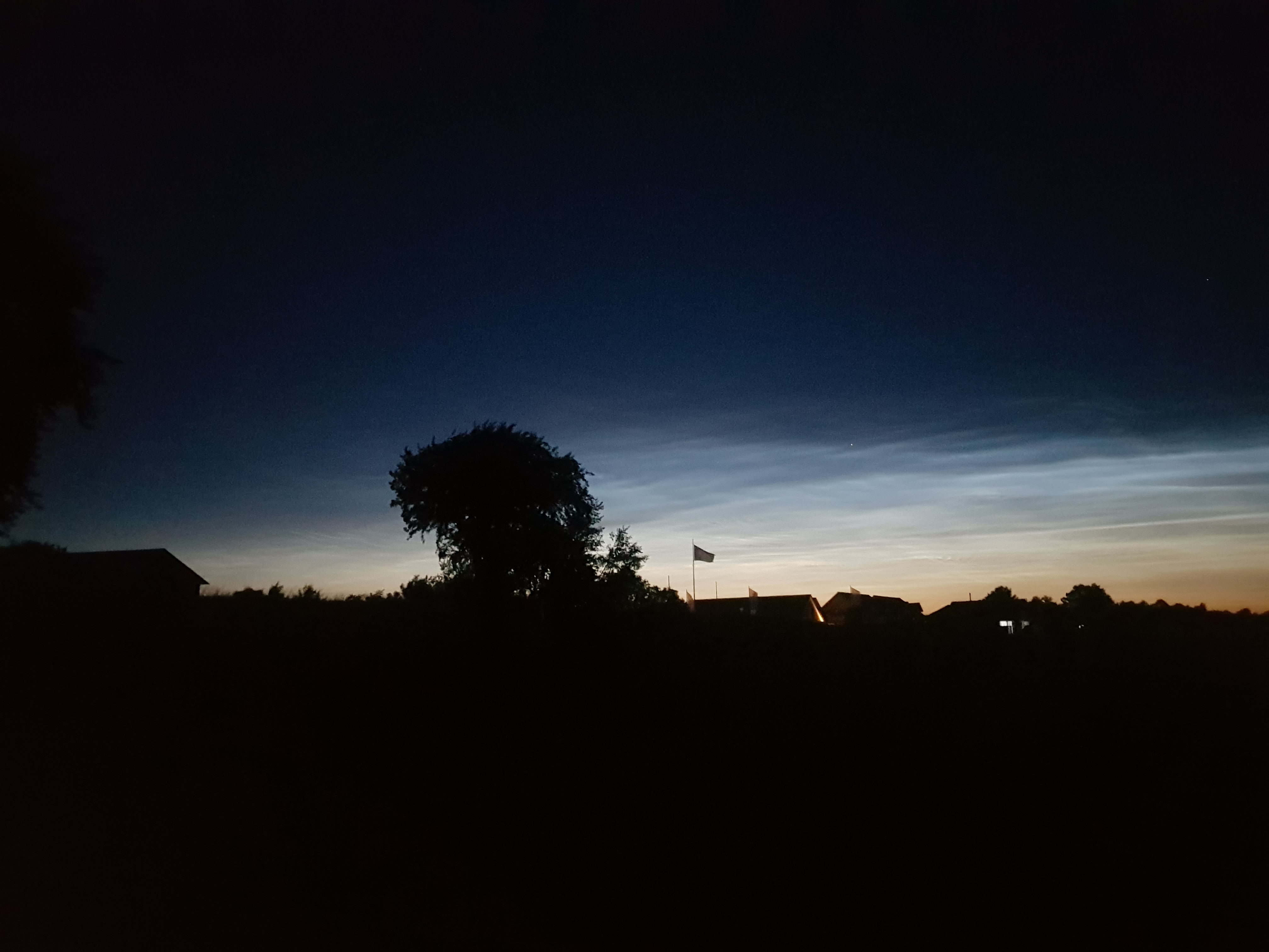 Bei einem Kurzurlaub in Holnis (bei Glücksburg) entdeckte ich kurz nach 24 Uhr einen erstaumlich hellen Schein hinter den Bäumen, der nicht mit der Mittsommernacht zu erklären war. Als ich schnell zum Strand ging, sah ich die NLC in voller Schönheit - ein beeindruckender Anblick! Ich fotografierte mit meinem Handy Galaxy S8, Blick ziemlich genau nach Norden, zunächst die westliche Seite der weit ausgebreiteten NLC.