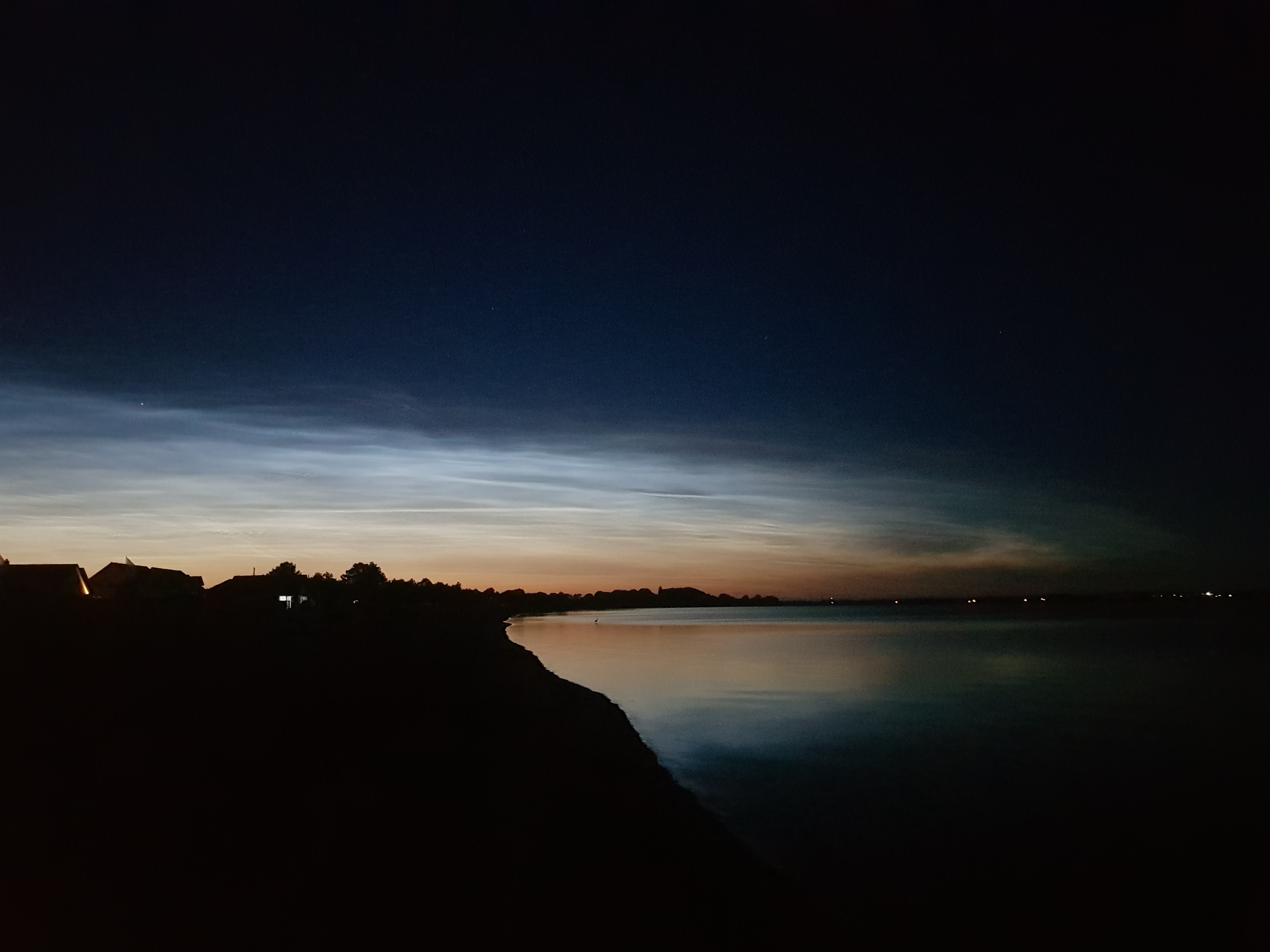Bei einem Kurzurlaub in Holnis (bei Glücksburg) entdeckte ich am 24. Juni 2022 kurz nach 0 Uhr einen erstaumlich hellen Schein hinter den Bäumen, der nicht mit der Mittsommernacht zu erklären war. Als ich schnell zum Strand ging, sah ich die NLC in voller Schönheit über der Landspitze, die in die Flensburger Förde ragt (im Hintergrund sieht man die Lichter des dänischen Ufers). Ich fotografierte mit meinem Handy Galaxy S8 – Blick in Richtung NNO – hier die östliche Seite der weit ausgebreiteten NLC.