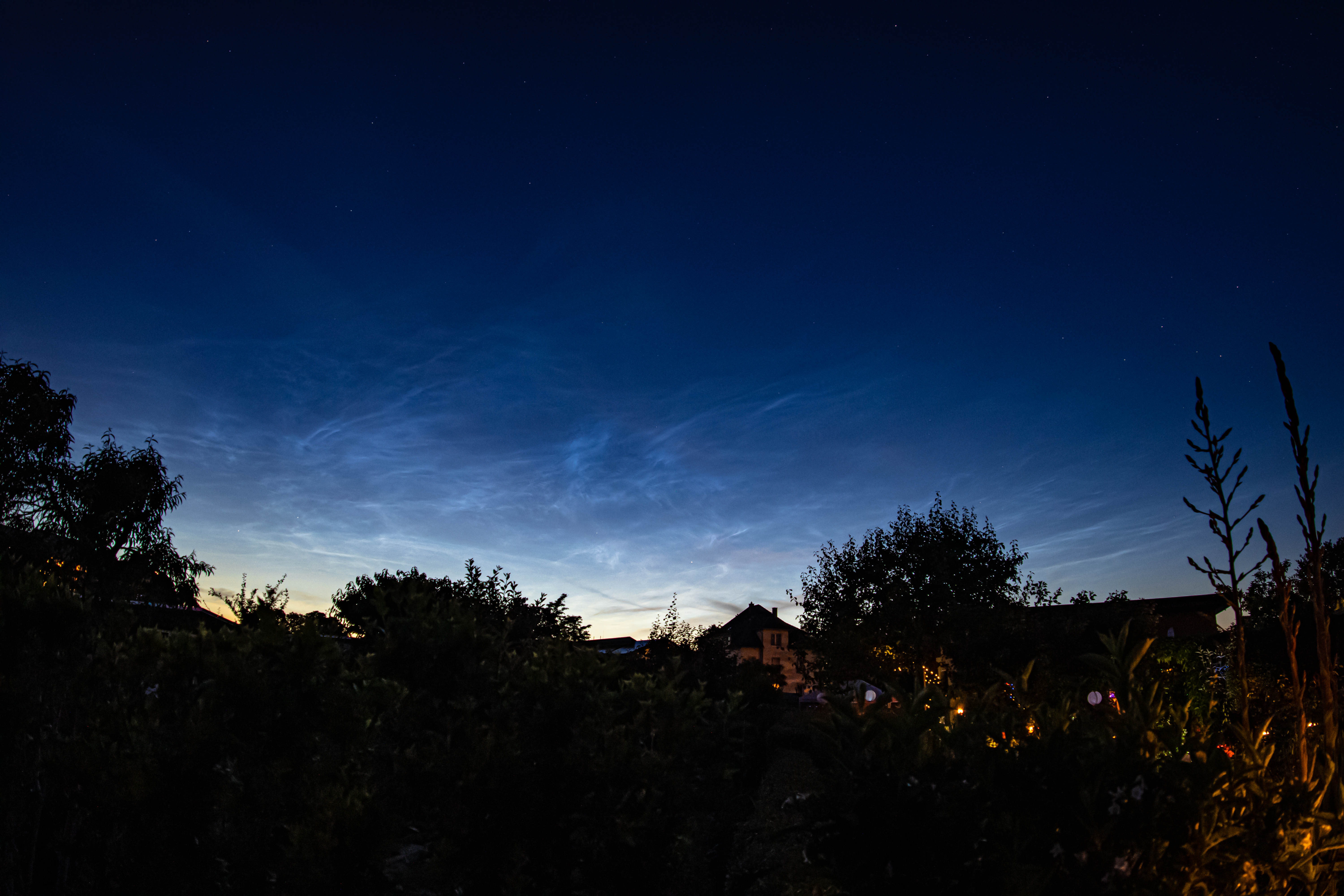 Erste Sichtung meinerseits von Leuchtenden Nachtwolken 2024. Ab 22:30 Uhr tauchte das wunderschöne Display am Nordhimmel auf. Am Anfang relativ hoch mit bis zu 30° zog es sich dann auf 10° Höhe über dem Horizont zurück. Gegen 23 Uhr zogen dann Schleierwolken aus Westen herein und die NLCs verschwanden so langsam dahinter.