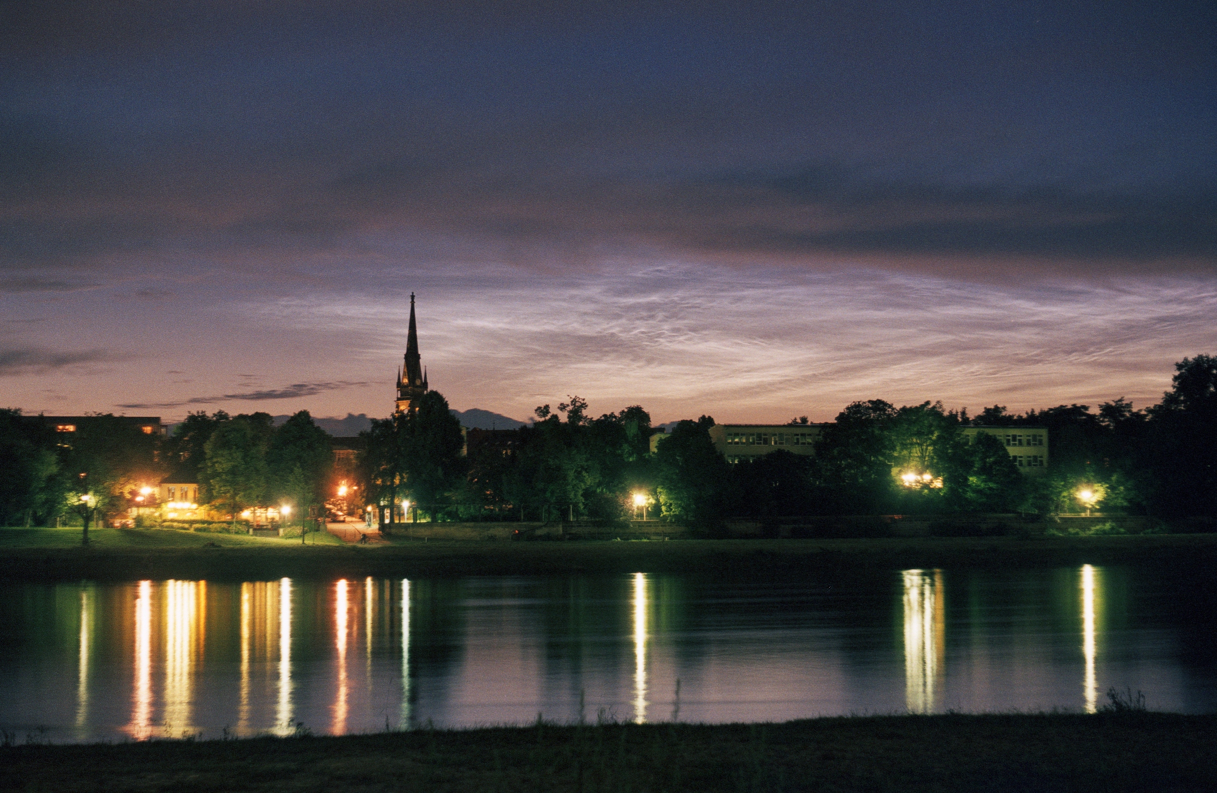 Die diesjährige Sichtbarkeitsperiode der Leuchtenden Nachtwolken (NLC) erwies sich im Juli als sehr ergiebig. Von Dresden aus konnte ich sogar an vier aufeinanderfolgenden Nächten (12./13. bis 15./16.) NLC beobachten. Dabei ergaben insbesondere die Bänder- und Wellenstrukturen am Abend des 13. zusammen mit dem Panorama der Dresdner Neustadt am anderen Elbufer hübsche Fotomotive. Der Rekord der azimutalen Ausdehnung wurde allerdings erst am folgenden Abend erreicht: Von Westsüdwest bis Nordnordost reichte da das einsehbare Wolkenfeld gegen 22.45 MESZ.