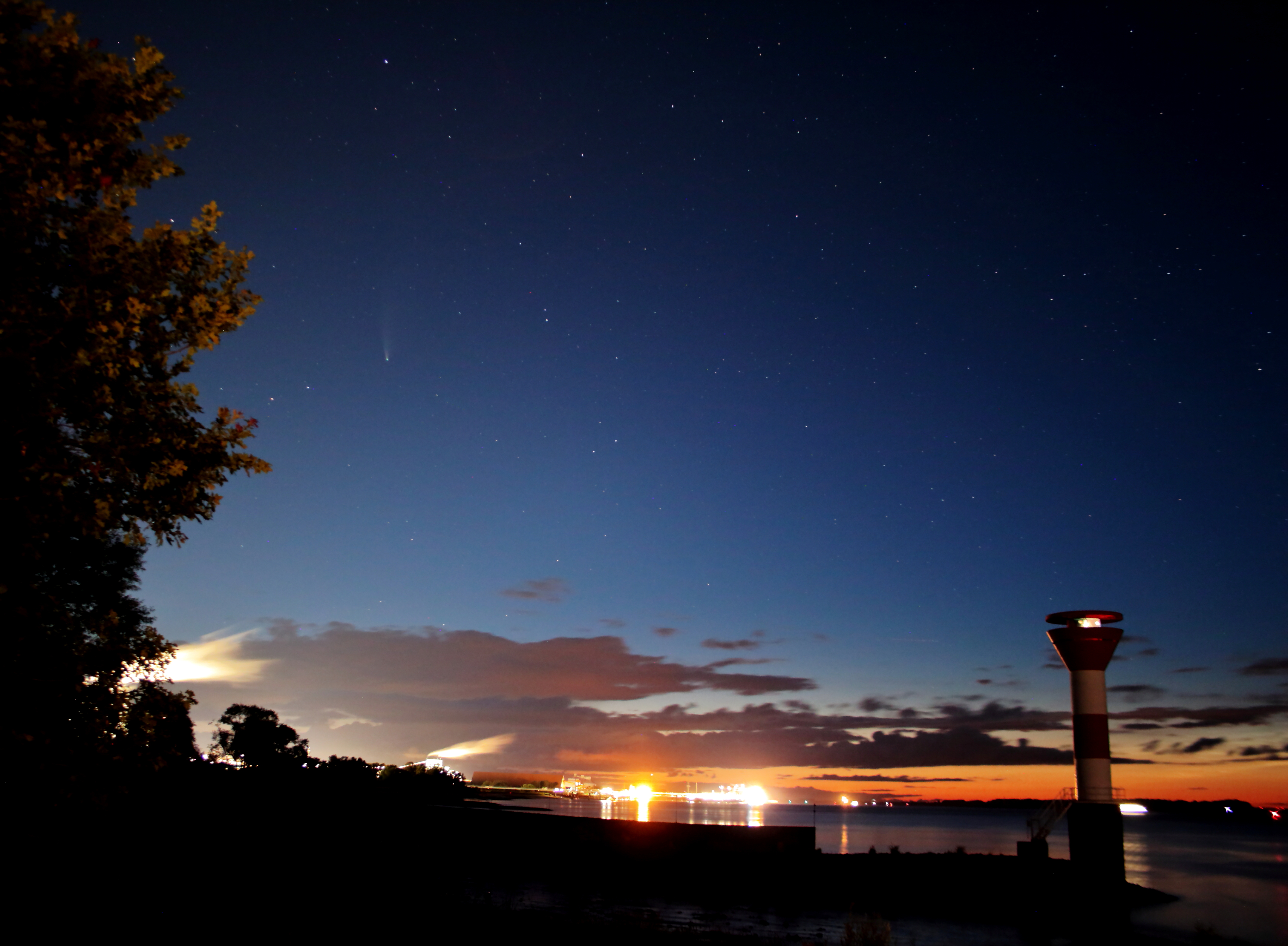Hallo liebe Redaktion der SuW, Komet Neowise mit maritimem Bezug. Aufgenommen am 21. Juli 2020 an der Elbe bei Stadersand. Der langsam blasser werdende Komet konkurriert hier mit den Lichtern und Rauchfahnen der Industrienanlagen. Damit Neowise sich auf seinem weiteren Weg nicht verirrt, weist ihm der Leuchtturm den Weg. Canon EOS 500 D, EFS 18-55 mm @ 18 mm, f 3,5, ISO 800, 15 Sekunden