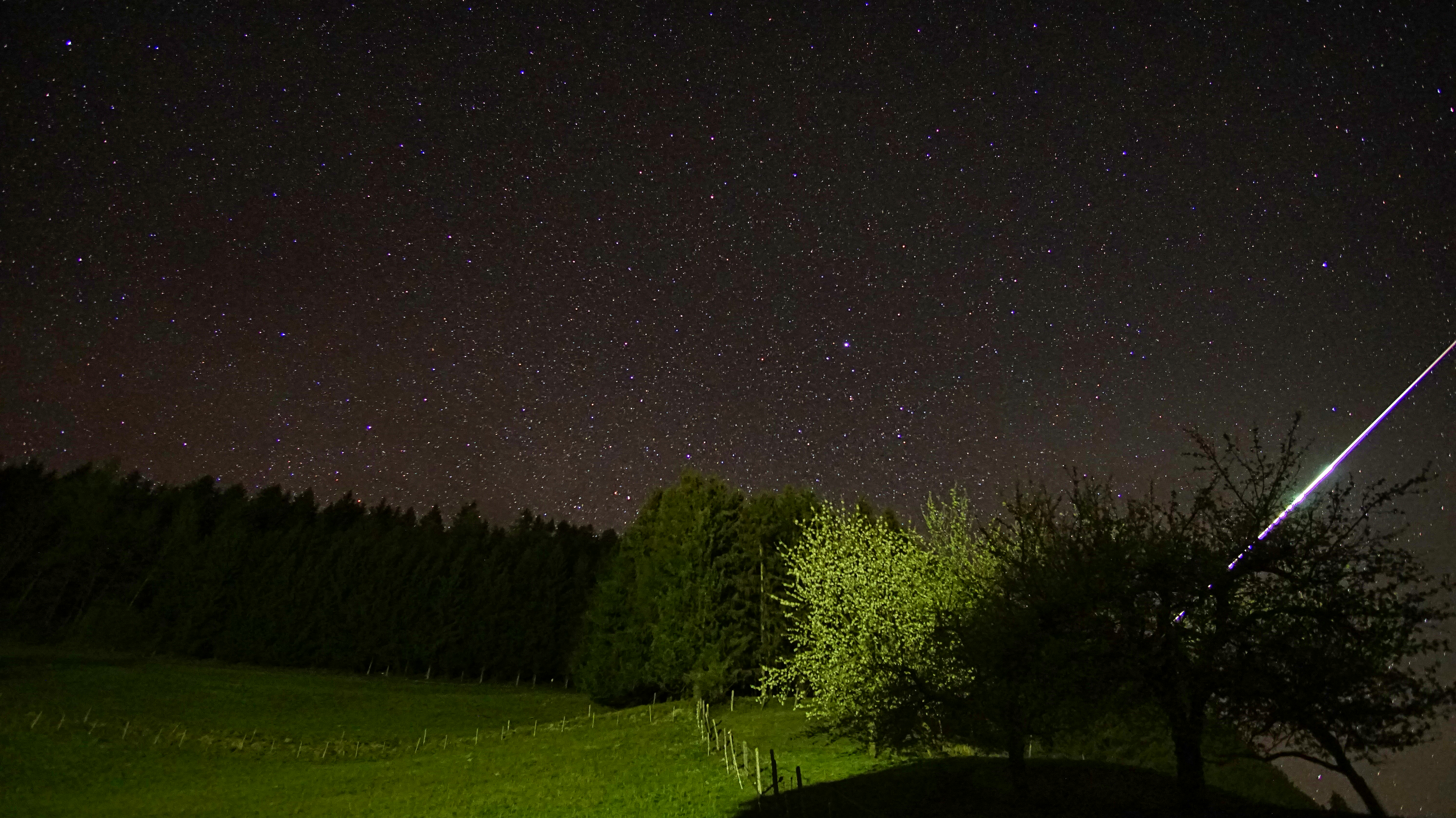 Am 23. April 2020 ließ ich meine Kamera für einen Sternschnuppen-Zeitraffer der Lyriden von Mitternacht weg selbstständig Aufnahmen machen. In einem der vielen Bildern war dieser enorme Lichtblitz einer sehr großen Sternschnuppe zu sehen!