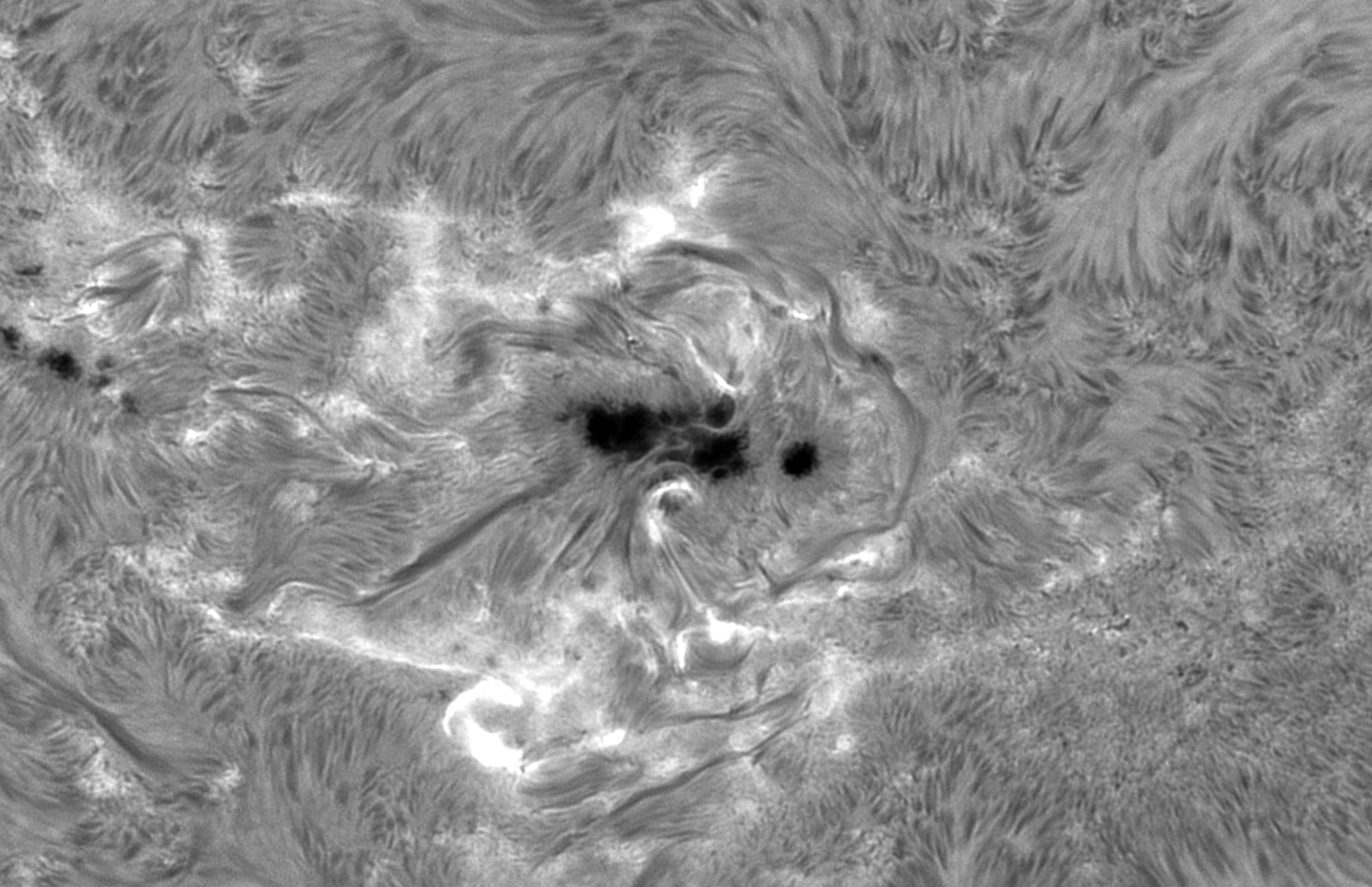 Dieser Sonnenfleck in der AR 3780 gehört zu den größten dieses Zyklus. Mich faszinierte vor allem die Lichtbrücke, die auf dem Foto im H-alpha-Licht gut zu erkennen ist. Das Foto entstand am Nachmittag und daher auch bei nur mäßigem Seeing.