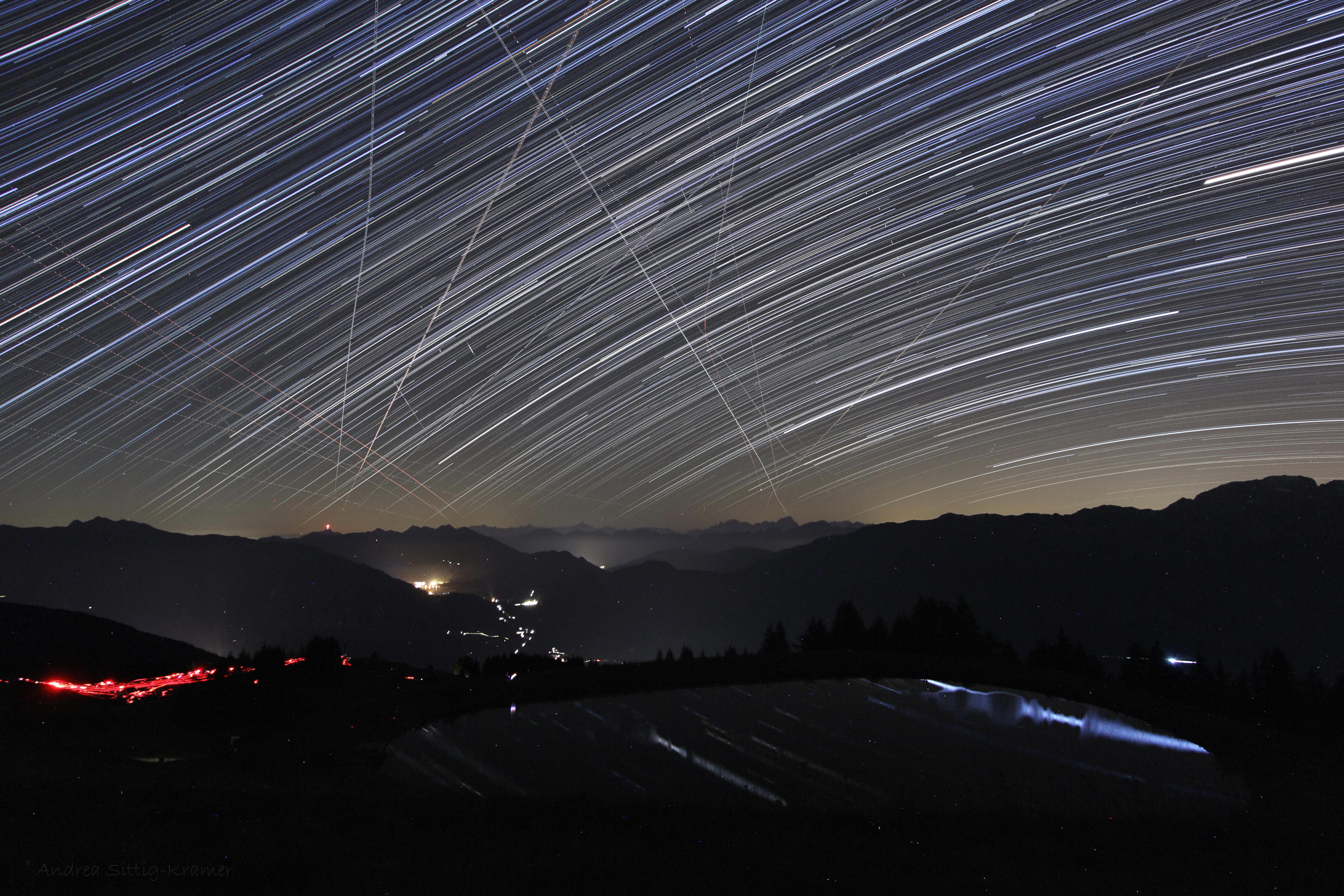 Anfang Oktober fand auf der Emberger Alm in Österreich das Internationale Teleskoptreffen (ITT) statt. Mehrere Nächte konnten wir einen wunderschönen, sternenklaren Himmel ohne Wolken, Mond und störendes Streulicht in der klaren Alpenluft auf knapp 2000 m Höhe genießen. Es herrschten meist traumhafte Beobachtungsbedingungen auf der Astro-Alm in Kärnten. Am Abend des 4. Oktober 2018 habe ich eine Fotoserie für ein Sternen-Strichspurenbild über die Zeitdauer von knapp zwei Stunden aufgenommen. Ich hatte meine DSLR oberhalb des Beschneiungsteiches mit Blick über Täler und Berge positioniert. Meine Absicht war es, dass sich die Sternenspuren auf der glatten Wasseroberfläche spiegeln sollten. Links unten strahlen die Rotlicht-Lampen der ITT-Teilnehmer um die Wette. Am Himmel kreuzen die Leuchtspuren der zahlreichen Flugzeuge, die der Sterne. Bei genauem Hinsehen kann man auch die kurzen Spuren einiger Meteore erkennen.