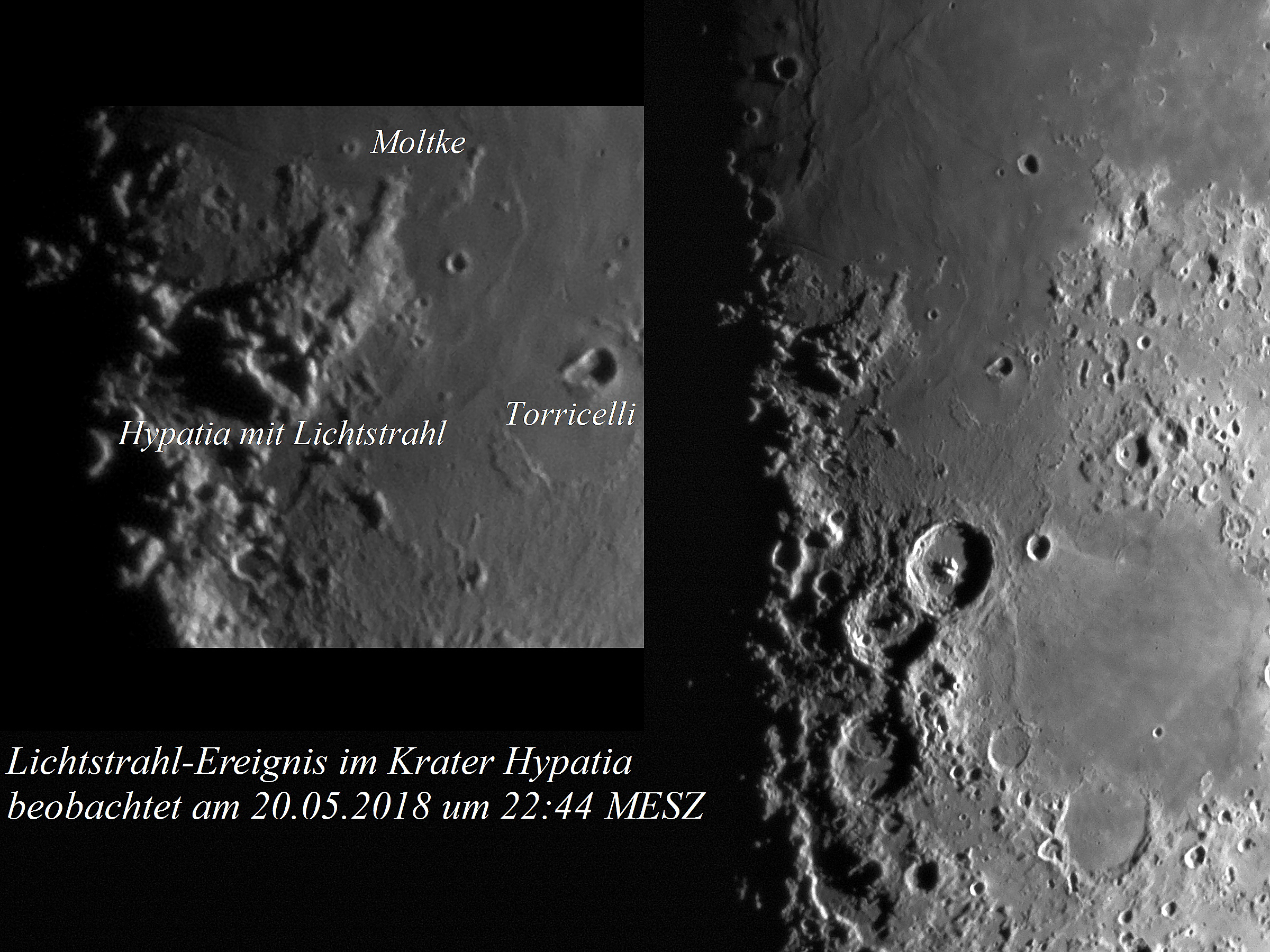 Das Lichtstrahl-Ereignis im Krater Hypatia hatte ich noch nicht beobachtet, nur den sehr bekannte Lichtstrahl im Krater Hesiodus hatte ich schon gesehen. Ein sehr interessanter Anblick, wie der Lichtstrahl erst schmal durch eine Lücke im östlichen Kraterrand fällt und sich dann verbreitert. Ein Kleinkrater vom Kraterboden ist im Lichtstrahl zu sehen. Auf jeden Fall werde ich den Lichtstrahl noch öfters zu beobachten versuchen, vielleicht hängt sein Erscheinungsbild ja auch von den aktuellen Mondephemeriden am Beobachtungstag ab. Die Lichtgrenze war bei der Aufnahme 20,2°. Mein Dank an den Vereinskollegen Udo, der den Lichtstrahl zuerst bemerkt hat, ich war gerade mit den Landegebieten von Apollo 11+17 beschäftigt.