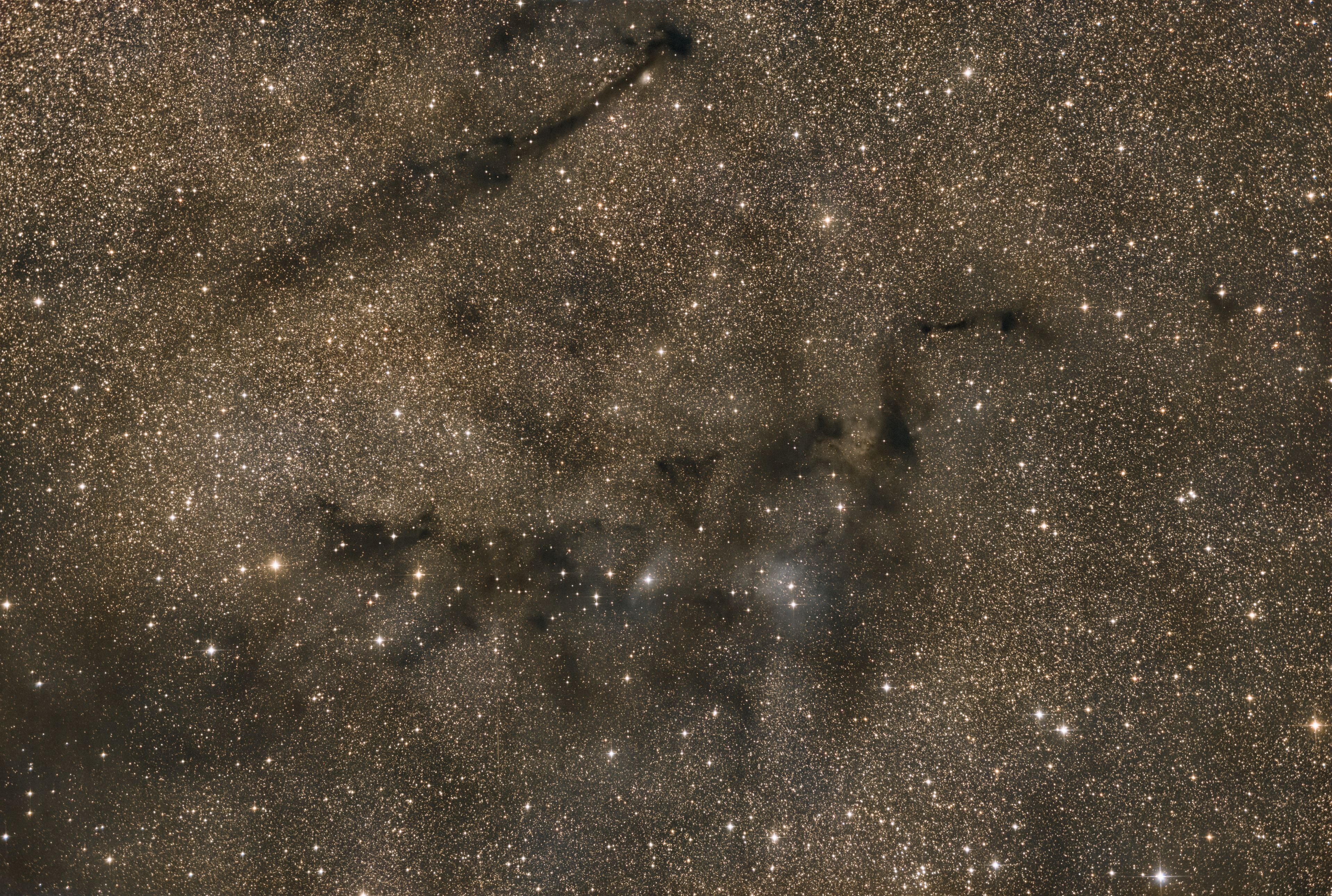 Im Sternbild Füchslein (Vulpecula), südlich vom Schwan (Cygnus) finden wir ein paar große Dunkelnebel. Ich habe mir für den erweiterten Test meines CCD-Monsters den Nessie-Nebel ausgesucht, der hier nun auch in Farbe dargestellt ist. Unterhalb der Bildmitte ist der Reflexionsnebel VdB 126 abgebildet, rechts daneben noch ein weiterer Reflexionsnebel (LBN 134).