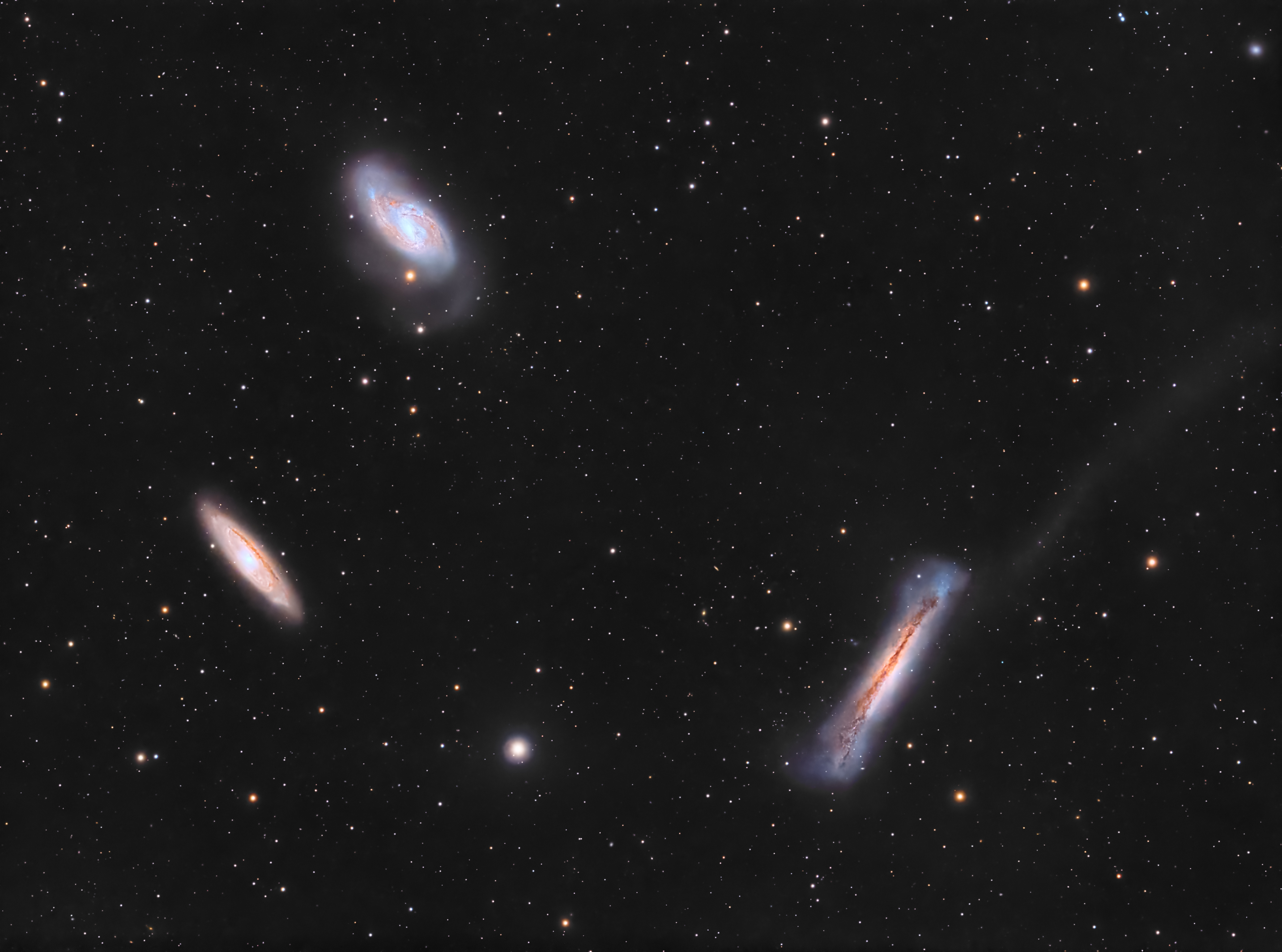 M65, M66 und NGC 3628 sind Teil einer Gruppe von Galaxien, die unserer Lokalen Gruppe ähnelt, obwohl ihre Komponenten in stärkerer Wechselwirkung miteinander stehen. M65 (unten links, auch bekannt als NGC 3623) ist eine Spiralgalaxie, die 1780 von Pierre Méchain entdeckt wurde, 22 Millionen Lichtjahre von uns entfernt und mit einer scheinbaren Helligkeit von 9,3 mag. Seine Spiralarme werden von einem System aus dunklem Staub durchzogen, in dem auf den hochauflösenden Bildern sehr helle blaue Sterne zu erkennen sind, ein Zeichen der Sternentstehung. Sein tatsächlicher Durchmesser würde 70000 Lichtjahre betragen und seine Masse würde 85 Milliarden Sonnenmassen entsprechen. M66 (oben links, auch bekannt als NGC 3627) ist eine Spiralgalaxie, die 1780 von Pierre Méchain entdeckt wurde und mit einer scheinbaren Helligkeit von 8,9 mag das hellste Mitglied des Tripletts ist. Die Galaxie ist 35 Millionen Lichtjahre von uns entfernt und hat einen Radius von etwa 50000 Lichtjahren. NGC 3628 (rechts, auch als Hamburger-Galaxie bekannt) ist mit einer scheinbaren Helligkeit von 10,4 mag das schwächste, aber auch das umfangreichste Mitglied des Tripletts. Es handelt sich um eine Spiralgalaxie ohne Balken, die etwa 35 Millionen Lichtjahre von uns entfernt ist und 1784 von William Herschel entdeckt wurde. Ihr auffälligstes Merkmal ist das breite dunkle Staubband am äußeren Rand ihrer Spiralarme. Ein weiteres, weniger offensichtliches Merkmal ist der Gezeitenschweif, der in dieser Aufnahme sehr deutlich sichtbar ist.