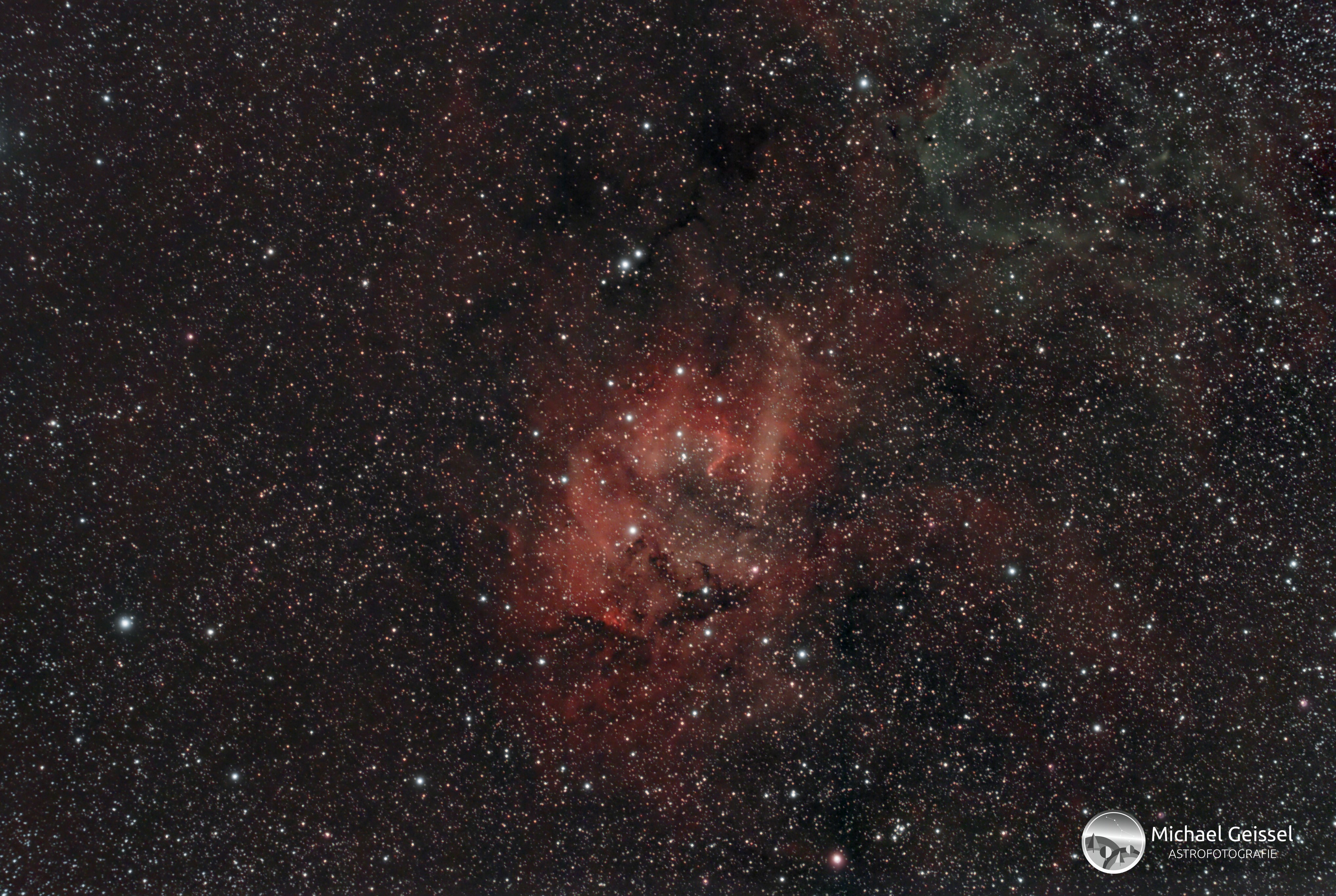 Der Löwennebel Sh2-132, so im Sharpless-Katalog bezeichnet, ist ein relativ schwacher Emissionsnebel, der sich etwa 10000 Lichtjahre entfernt im Sternbild Kepheus der König befindet. Da wir beim Betrachten von Wolkenformationen an unserem irdischen Himmel oft Objekte visualisieren, sehen einige einen Löwen in dieser Himmelswolke mit dem Kopf nach links oben und dem Körper, den Beinen und dem Schwanz nach rechts verlaufend. Eine verdunkelnde dunkle Spur aus Staub und Gas befindet sich im "Löwenkopf" und scheint die Gesichtszüge des Löwen zu bilden. Diese leuchtschwache HII-Region beherbergt mehrere Wolf-Rayet-Sterne. Durch ihre sehr hohe Oberflächentemperatur von bis zu 120000 Kelvin, stoßen diese Sterne in 1000 Jahren bis zu einer Sonnenmasse an Materie ab. Diese wird durch die immense Strahlung auf mehrere Tausend km/s beschleunigt.