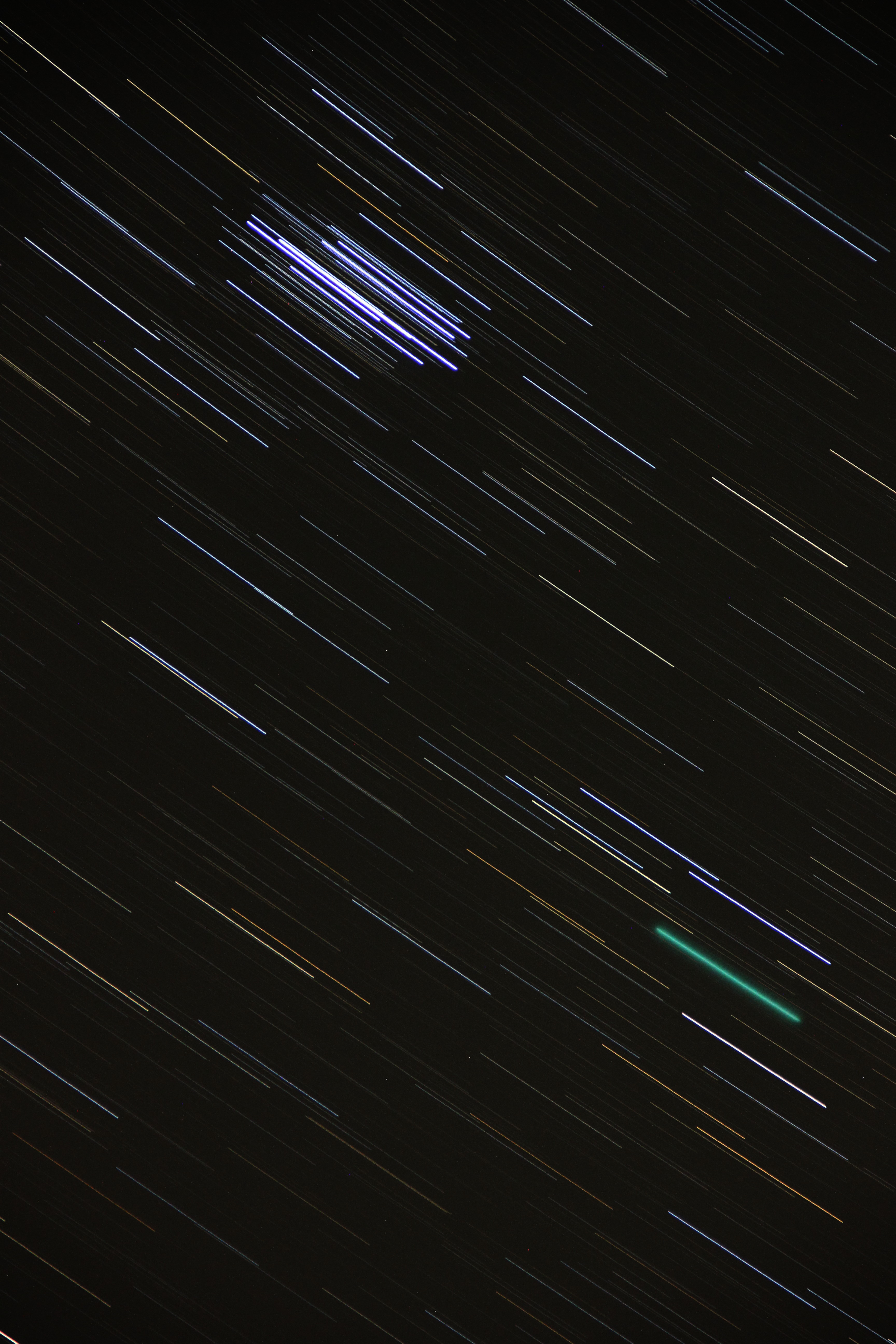 In der Nacht vom 17. zum 18.01.2015 konnte ich den Kometen C/2014 Q2 - Lovejoy - bei wolkenfreiem Himmel über Uelzen beobachten und fotografieren. Der Komet war leicht mit dem Fernglas unterhalb der Plejaden (M45) zu finden. Eine Aufnahmenserie habe ich mit Startrails zu Strichspuren zusammengefügt. Dadurch wird auch die intensive grüne Farbe des Kometen sichtbar. Die vielen hellen Lichtspuren über Lovejoy sind diejenigen der Plejaden.