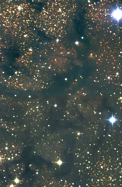 LDN 673 gehört zu den ausgedehnten Molekülwolken der Milchstraße im Sternbild Adler. Hier ein Mosaik (45 x 31 Bogenminuten) vom zentralen Teil dieser Dunkelwolke, Gesamtbelichtungszeit 10h 50min (LR-HAlpha-GB, alle 2 x 2-Binning)
