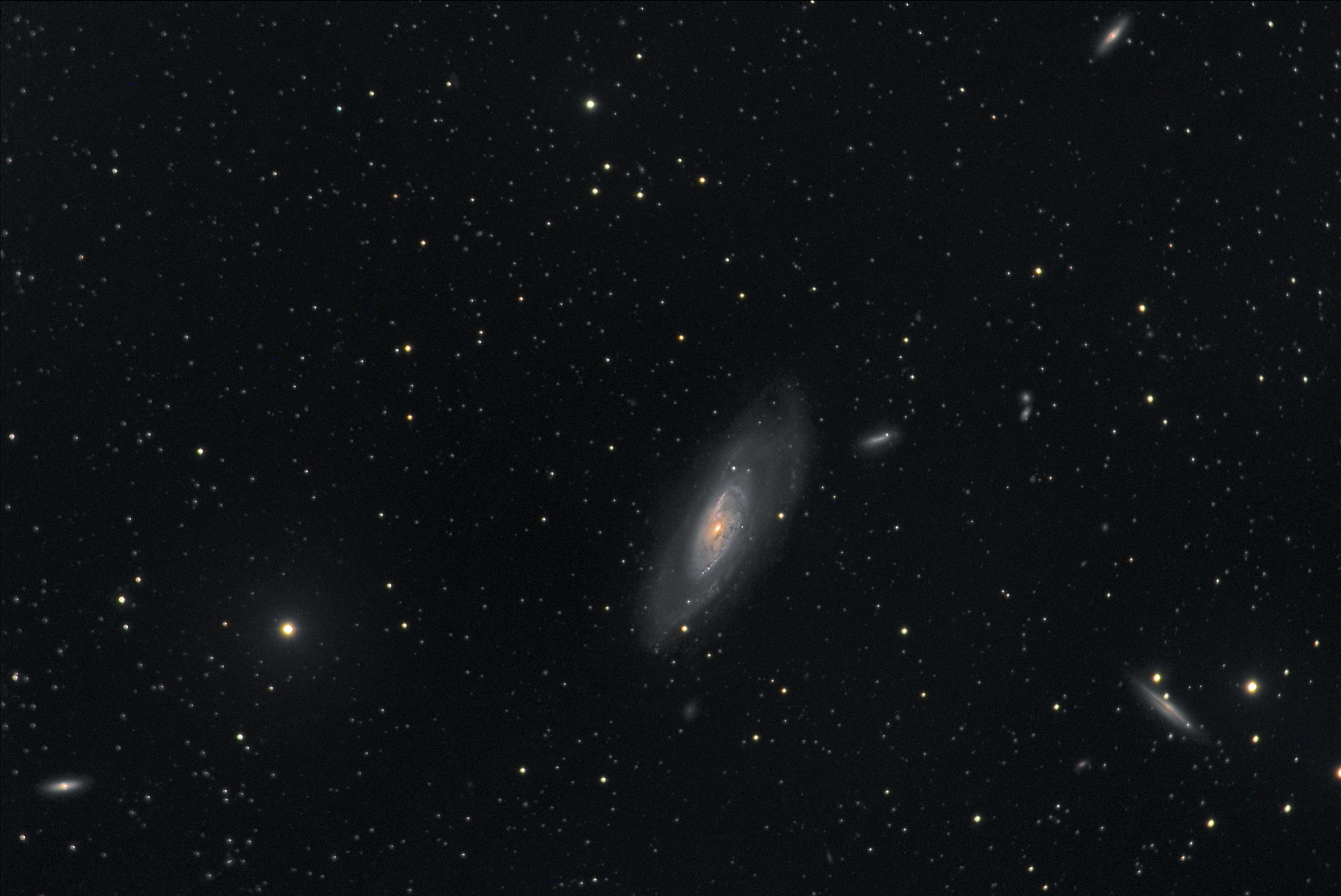 Die wunderschöne Galaxie M 106 liegt eingebettet zwischen einigen kleineren Sternsystemen. Sieben der helleren Galaxien sind mit NGC-Nummern versehen. Die Abbildung dieses Felds hat mich seit längerem interessiert. Die Aufnahme litt etwas unter durchziehenden Wolken, dennoch waren etwa drei Stunden Belichtungszeit für das Summenbild brauchbar.