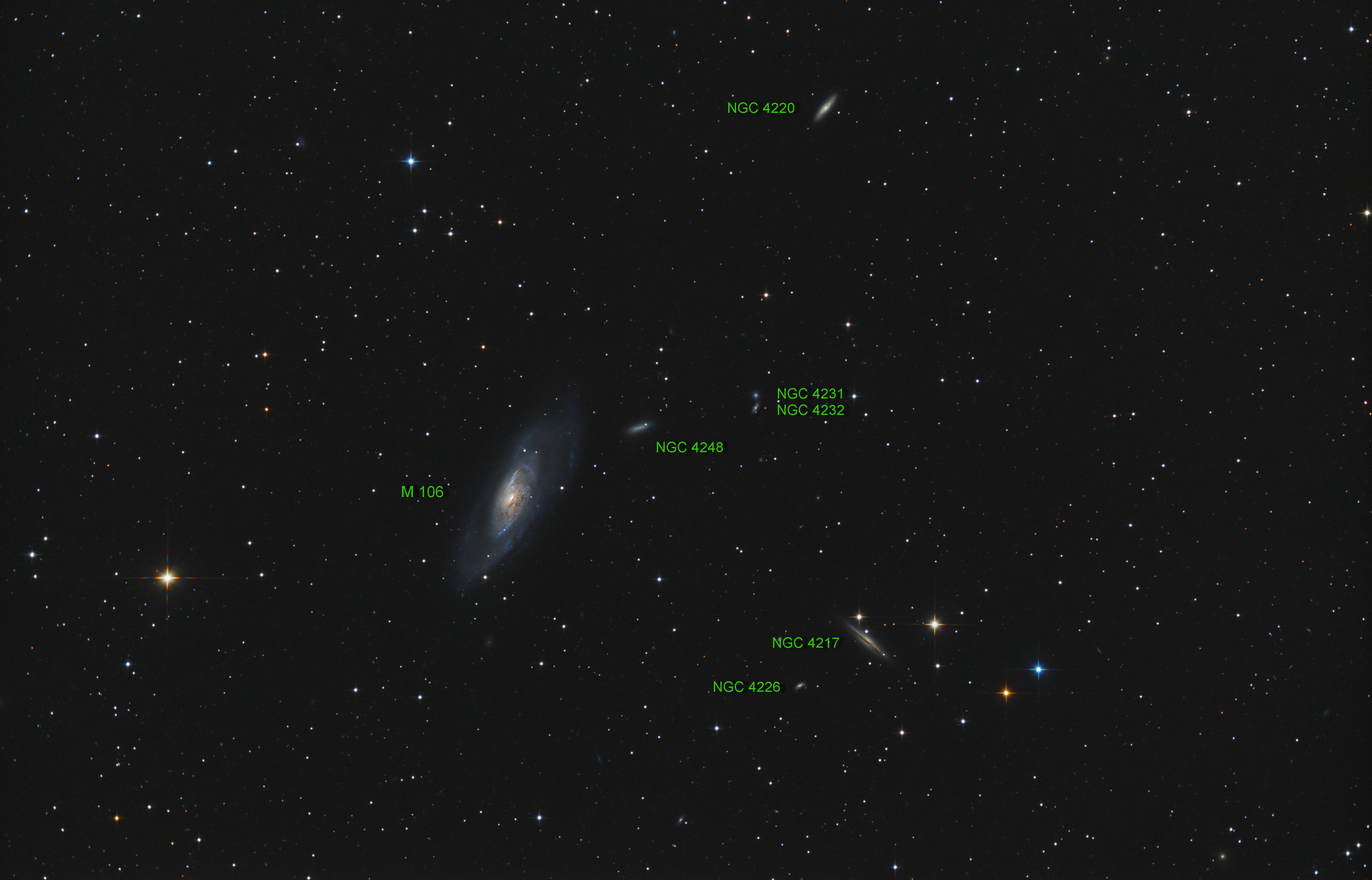 M106 (NGC4258) ist eine Spiralgalaxie vom Typ Sbp, wobei das p auf peculiar hinweist. Mit einer Entfernung von rund 24 Millionen Lichtjahren liegt die Galaxie in der Umgebung mehrer Galaxiengruppen, etwa der Ursa-Major-Gruppe, der Coma-Sculptor-Gruppe und der Canes-Venatici-Gruppe. Sie hat einen Durchmesser von etwa 135000 Lichtjahren und einen aktiven Kern, sodass sie auch zu den Radioquellen zählt.