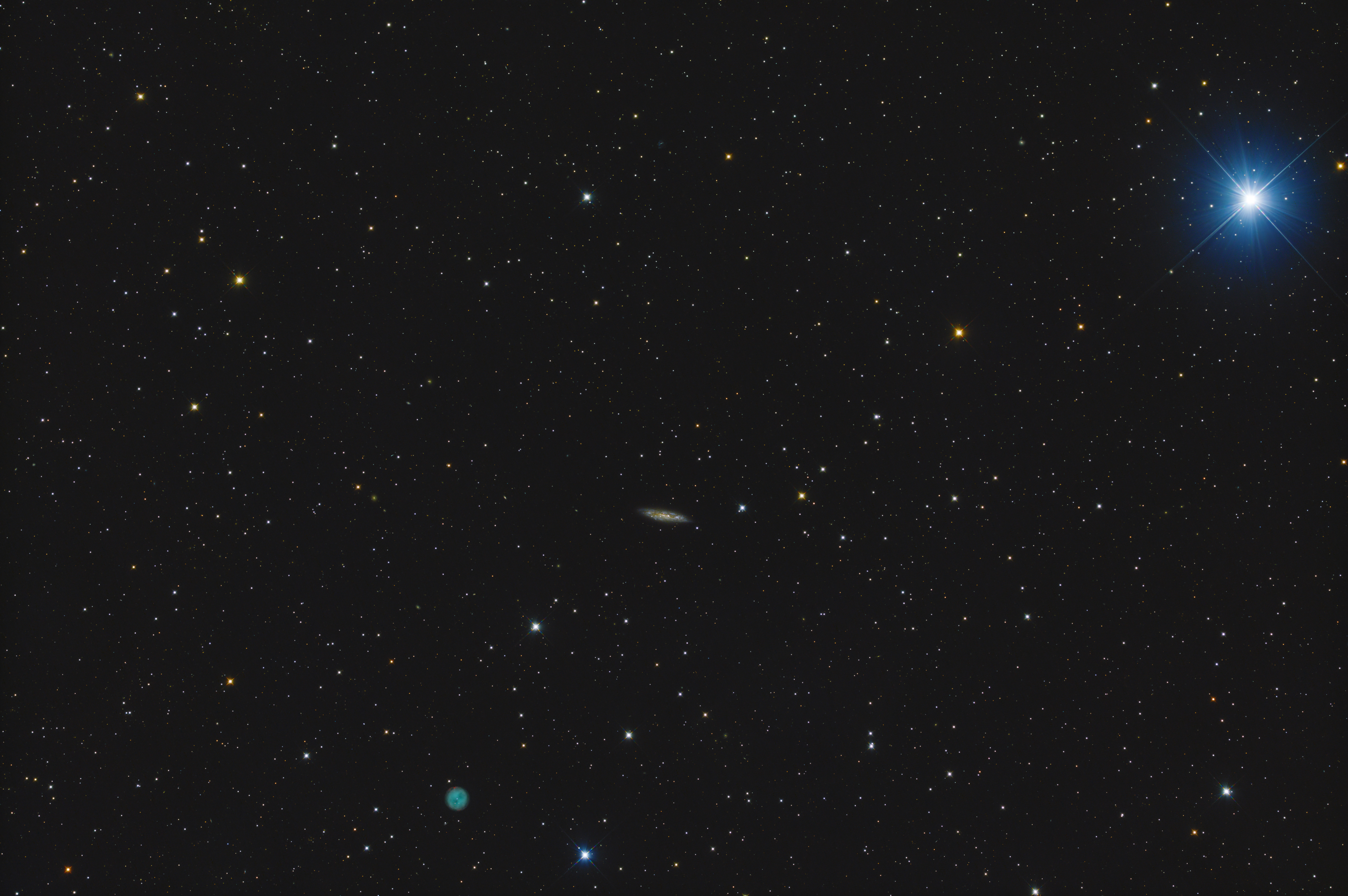 In das Bildfeld des Takahashi Epsilon 130 passen zwei sehr unterschiedliche Objekte im Sternbild Großer Bär. Einerseits die Galaxie M 108, eine Spiralgalaxie mit einem Durchmesser von 100000 Lichtjahren und etwa 34 Millionen Lichtjahre entfernt. Andererseits mit M 97 einer der etwa 1600 Planetarischen Nebel in unserer Milchstraße. Die vom Zentralstern ausgestoßene Hülle hat etwa zwei Lichtjahre Durchmesser und dehnt sich mit etwa 40 km/s im Weltraum aus. Der Nebel wurde im Jahr 1781 von dem französischen Astronomen Pierre Méchain entdeckt und von Charles Messier in seinem Katalog hinzugefügt. William Henry Smyth klassifizierte ihn im Jahr 1844 als Planetarischer Nebel, Lord Rosse prägte Mitte des Jahrhunderts den Namen »Owl Nebula«.