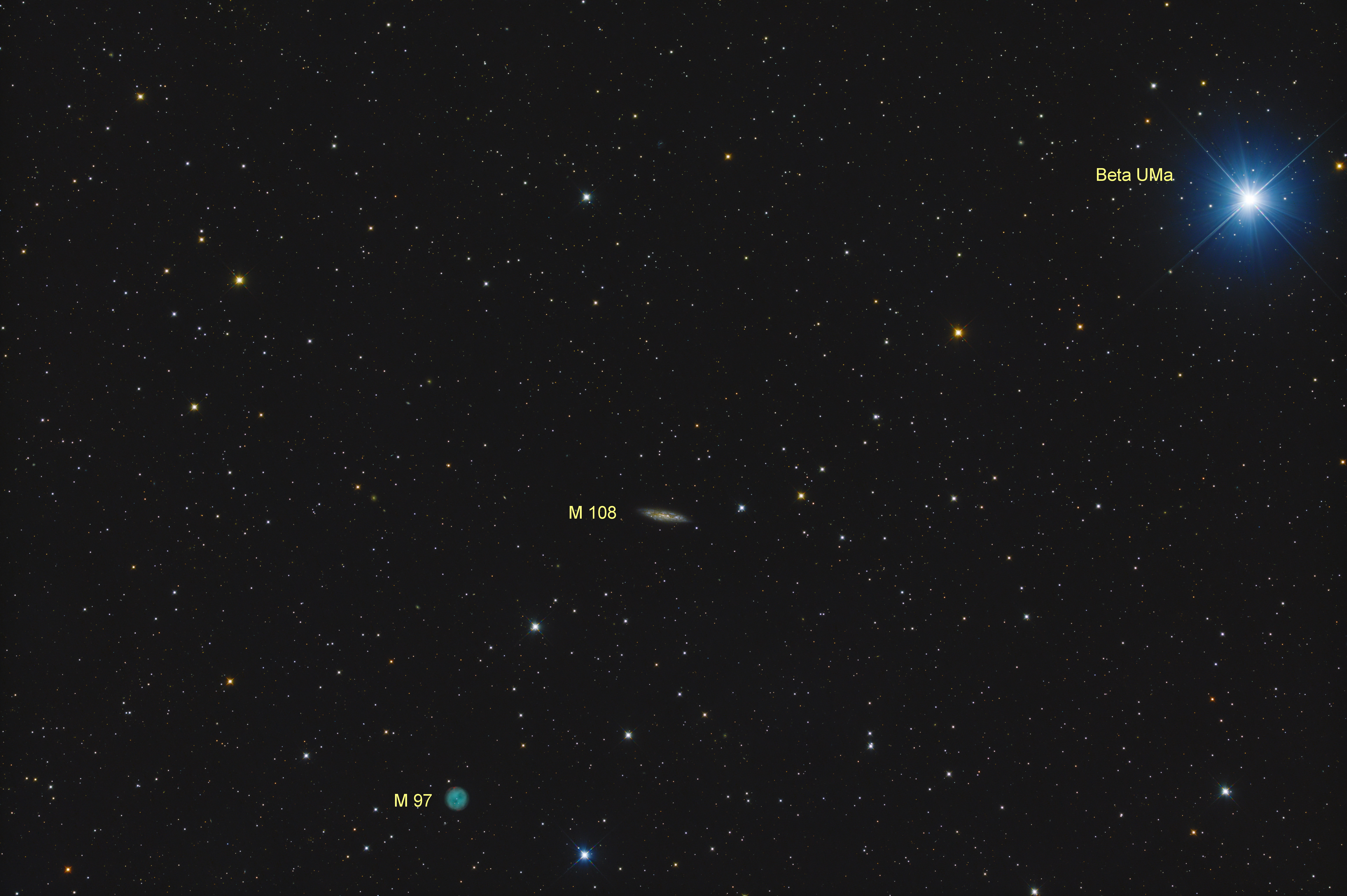 In das Bildfeld des Takahashi Epsilon 130 passen zwei sehr unterschiedliche Objekte im Sternbild Großer Bär. Einerseits die Galaxie M 108, eine Spiralgalaxie mit einem Durchmesser von 100000 Lichtjahren und etwa 34 Millionen Lichtjahre entfernt. Andererseits mit M 97 einer der etwa 1600 Planetarischen Nebel in unserer Milchstraße. Die vom Zentralstern ausgestoßene Hülle hat etwa zwei Lichtjahre Durchmesser und dehnt sich mit etwa 40 km/s im Weltraum aus. Der Nebel wurde im Jahr 1781 von dem französischen Astronomen Pierre Méchain entdeckt und von Charles Messier in seinem Katalog hinzugefügt. William Henry Smyth klassifizierte ihn im Jahr 1844 als Planetarischer Nebel, Lord Rosse prägte Mitte des Jahrhunderts den Namen »Owl Nebula«.