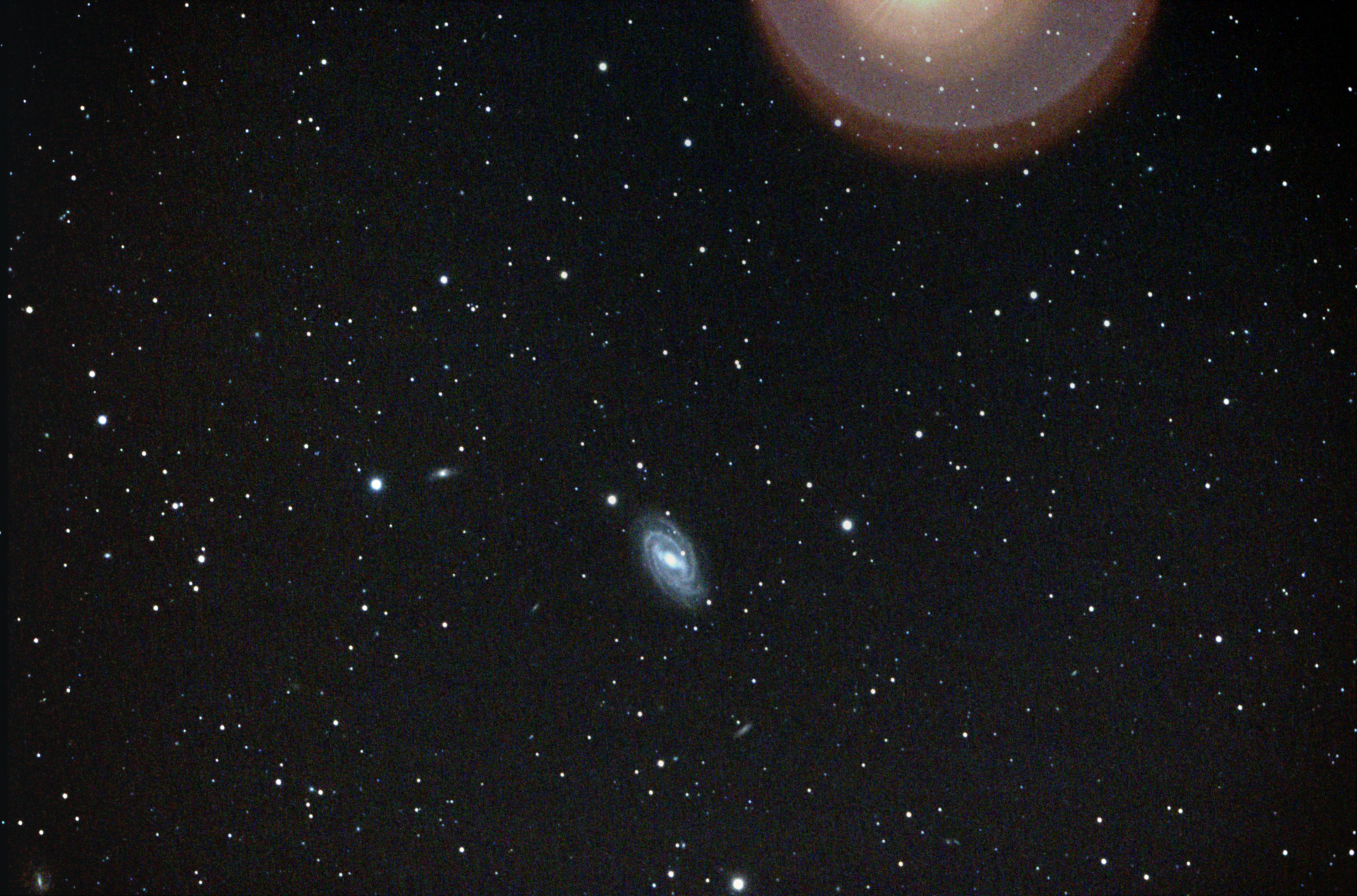 Die kleine Balkenspirale M 109 mit 10,6 mag liegt nahe dem mit +2 mag sehr hellen Stern Gamma UMa (Phekda). Obwohl gerade außerhalb des Bildfeldes plaziert, ergibt sich trotzdem noch dieser helle Reflex, welcher aber das Bild eher reizvoller macht. Neben M 109 (NGC 3992) sind noch ein paar schwächere Galaxien aufzufinden, von denen PGC 37796 mit 17,2 mag gerade noch erahnbar ist.