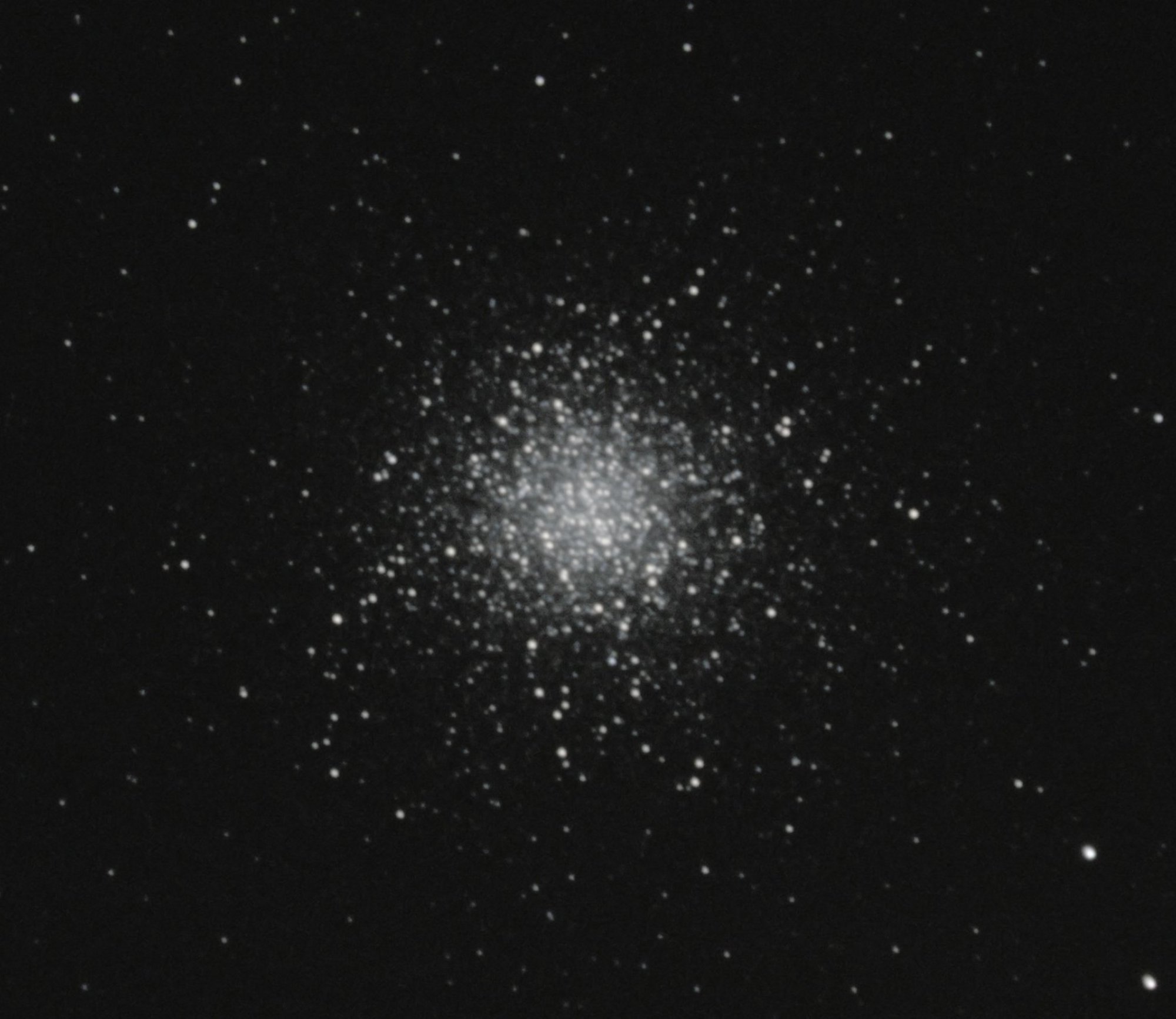 Am 2. Oktober konnte ich mir eine längere Belichtungszeit auf M 13 erlauben, da ich erstmals ein Autoguiding benutzte. Somit traute ich dem Autoguiding auch eine Powermate 2x zu und siehe da ... das klappte. Der Unterschied, ob 7x180 Sekunden oder 40x30 Sekunden Belichtungszeit ist bedeutend. Und ob 800 oder 1600 mm Brennweite ebenfalls. Dieser erste Versuch spornt mich an, in dieser Richtung weiter zu arbeiten ... obschon, Astronomie als Hobby ist eine Freude und keine Arbeit.