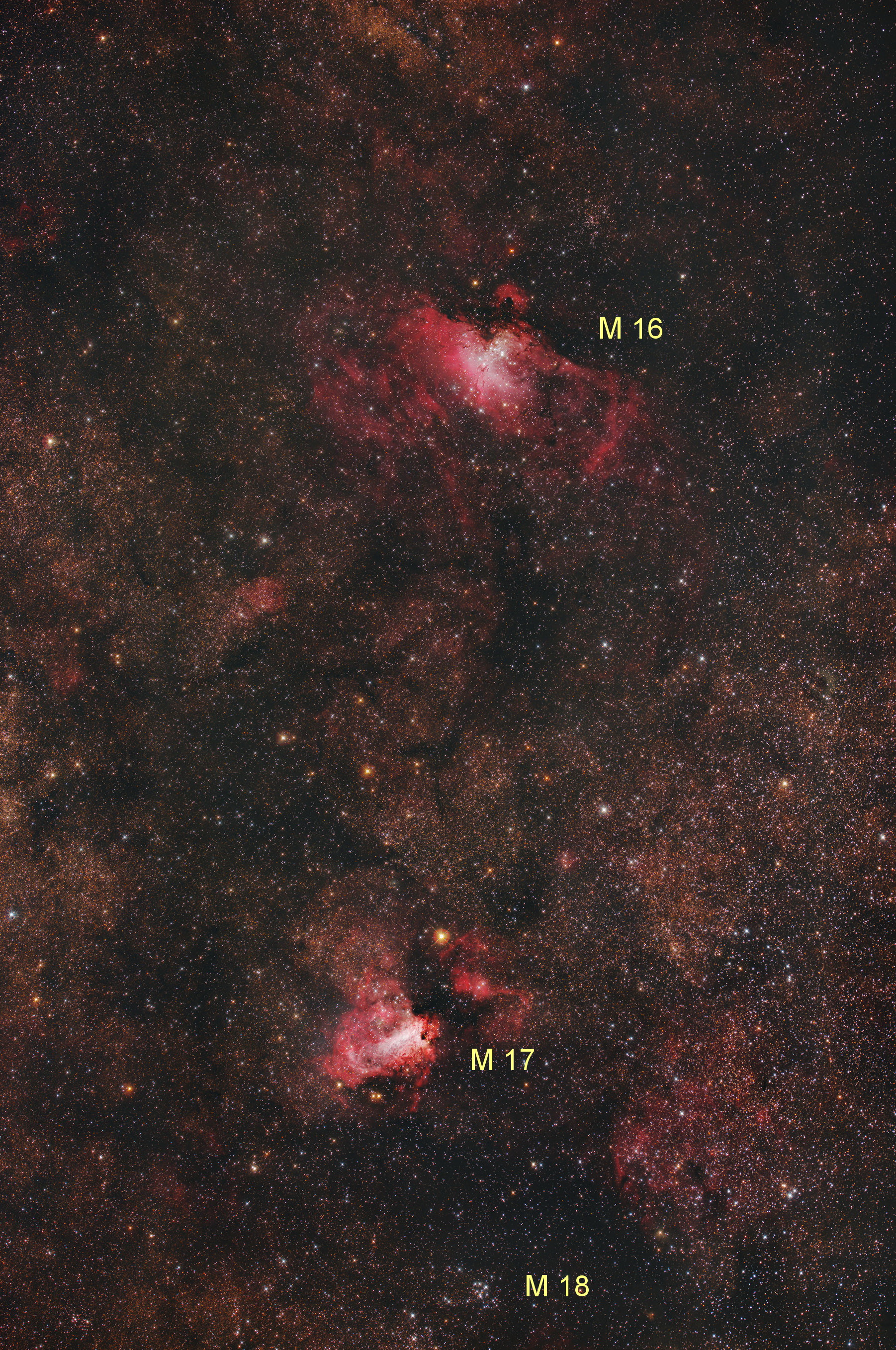 Im Sternbild Schütze befinden sich gleich 3 Objekte aus dem Messier-Katalog nahe nebeneinander, nämlich der Adlernebel M 16, der Omega-Nebel 17 und der Offene Sternhaufen M 18. Sie passen zusammen gerade noch in das Bildfeld bei 430 mm Brennweite und ein Canon EOS6D.