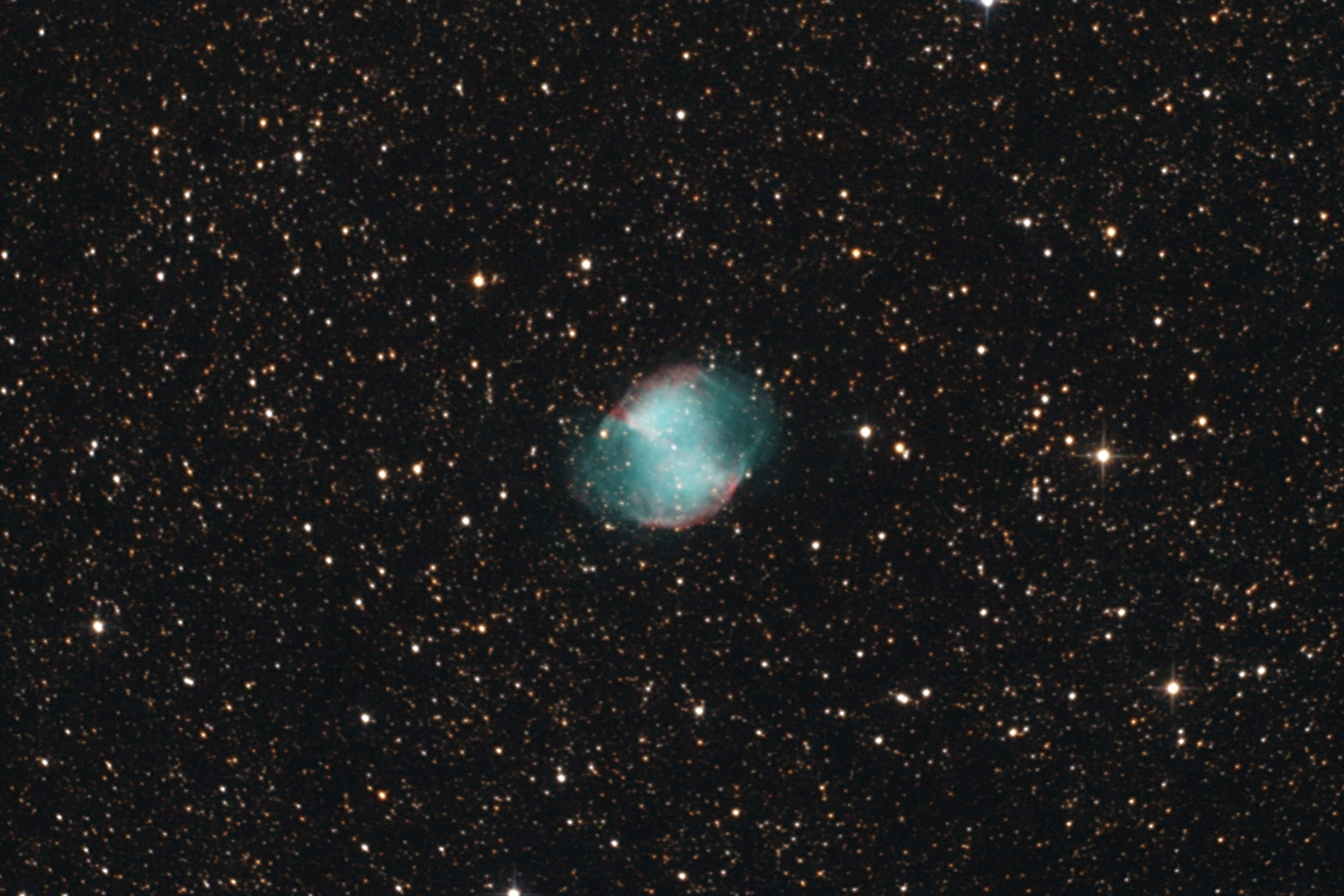 The Dumbbell (M 27) is a planetary nebula in the constellation Vulpecula, at a distance of 1360 lightyears. This was the first planetary nebula to be discovered, by Charles Messier in 1764. At its brightness of 7.5 magnitude and a diameter of 8 arcminutes, it is easily visible in binoculars.