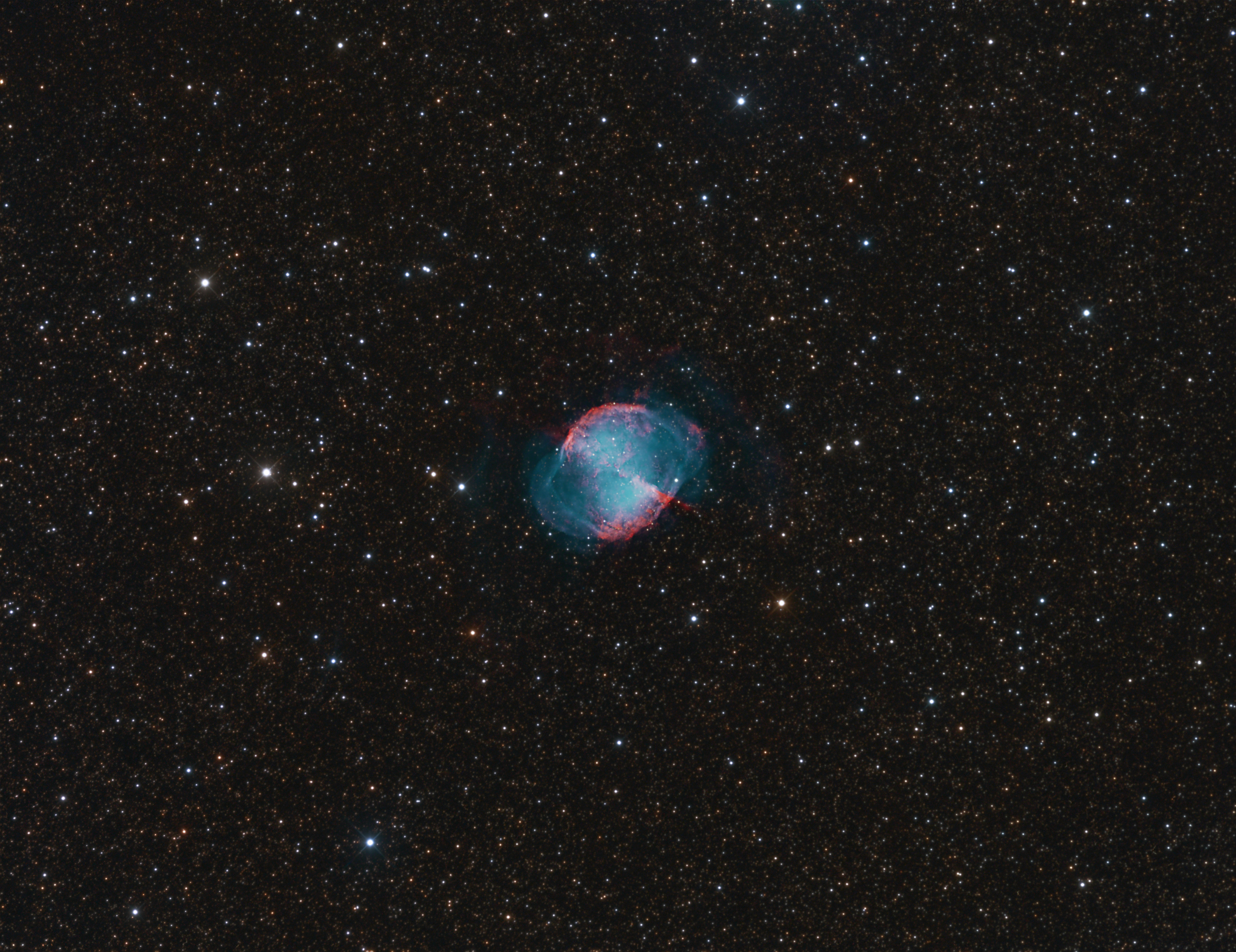 M 27 ist ein heller Planetarischer Nebel in rund 1300 Lichtjahren Entfernung. Er ist das Ergebnis einer von einem Roten Riesen in seiner Endphase abgestoßenen Hülle. Diese dehnt sich nach wie vor mit etwa 30 km/s aus. Der Kern des Riesensternes ist ein über 100000 Kelvin heißer Weißer Zwerg im Zentrum des Nebels.