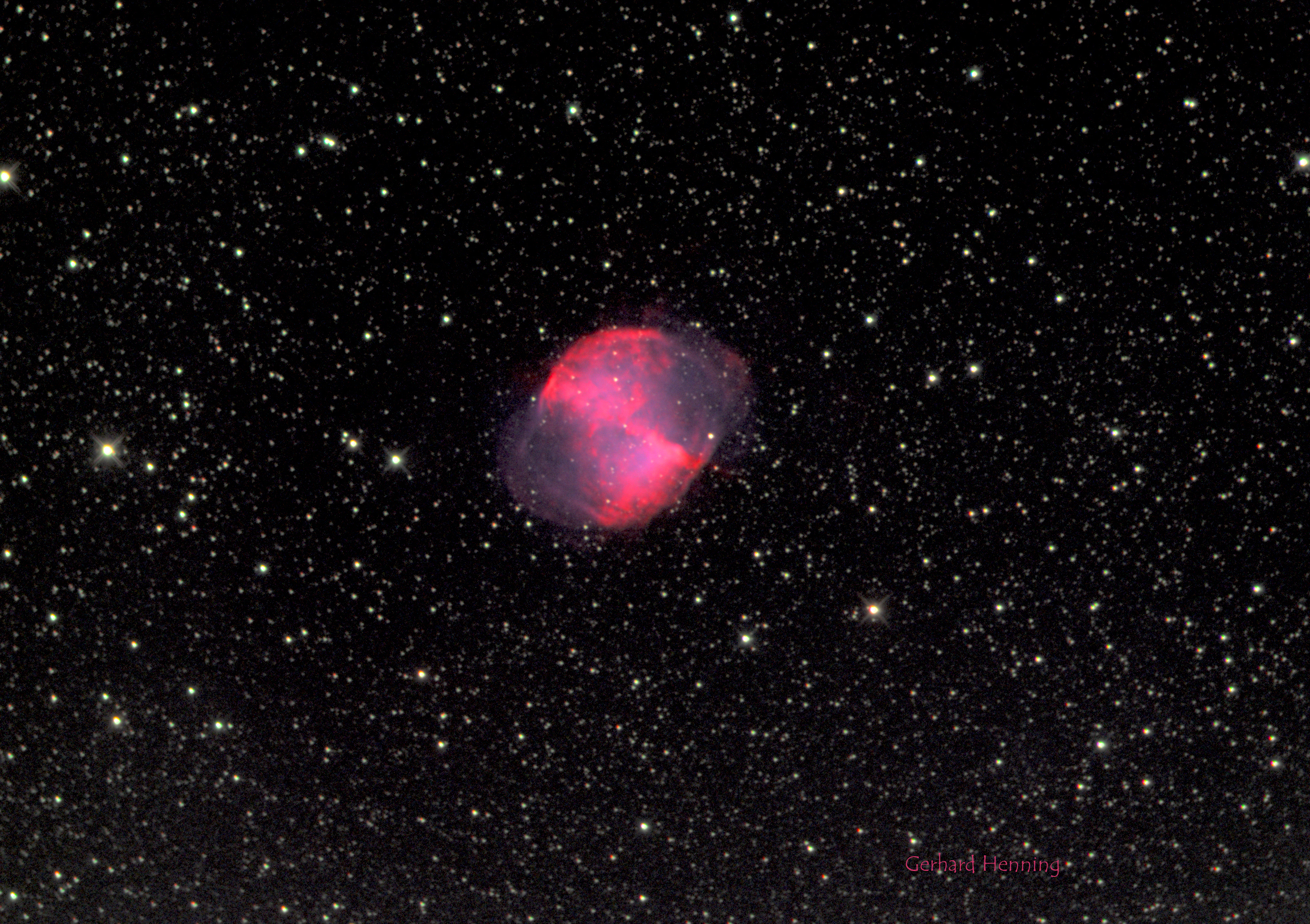 M 27, auch Hantelnebel genannt, hat eine Entfernung von ca. 1240 Lichtjahre. Der Zentralstern (Weißer Zwerg) ist in diesem Planetarischen Nebel gut zu erkennen. H-alpha-Kanal entspricht rot, OIII entspricht blau.